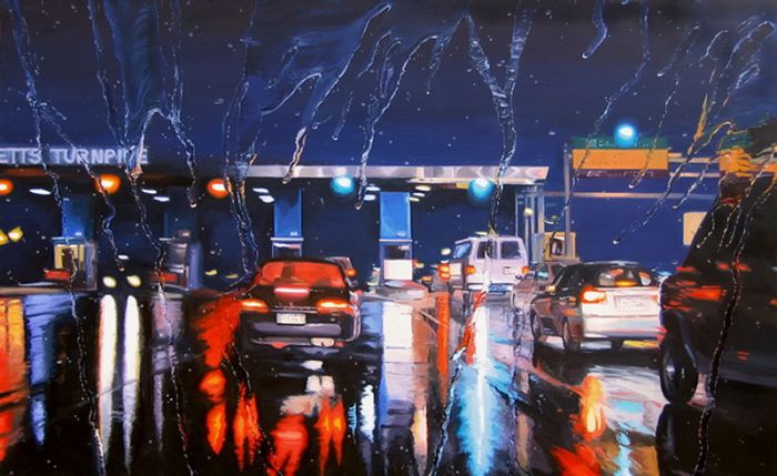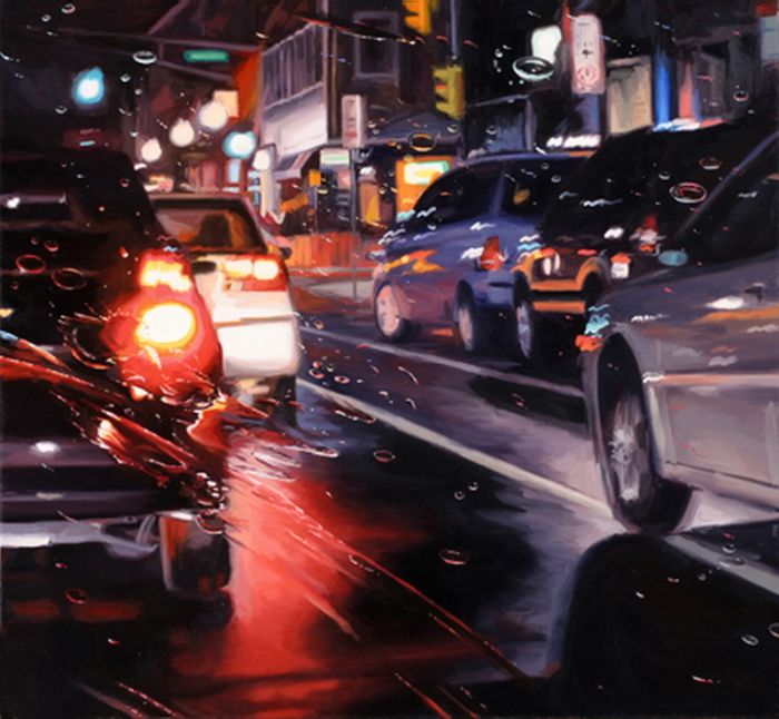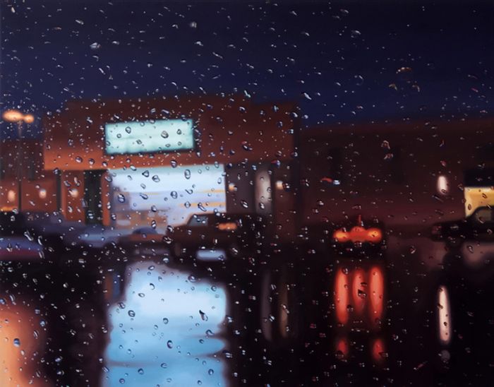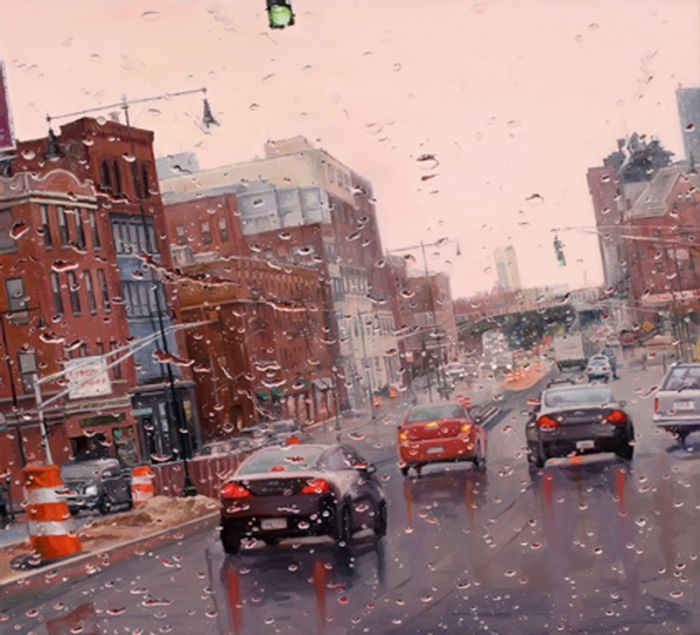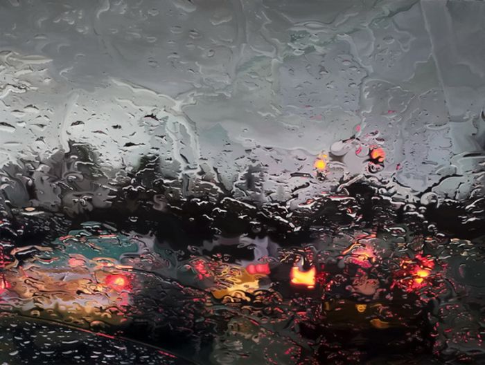 "Дождливые пейзажи". Смотрите, и учтите, что это не фотошоп и фотография где за не хуй делать можно натянуть такую хуйню. Просто представьте - перед вами холст, из "оружия" у вас только кисть и краски, и вам нужно так передать капли воды на переднем плане, что бы за ними граммотно в композицию вливался пейзаж, думаю комментарии излишни.