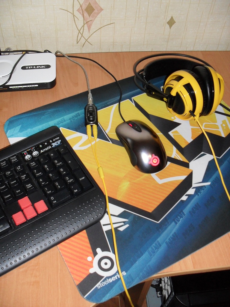 Мышка Х7 с паучком. Коврик Steelseries с рисунком из варкрафта. Уши дешевые Sven. |