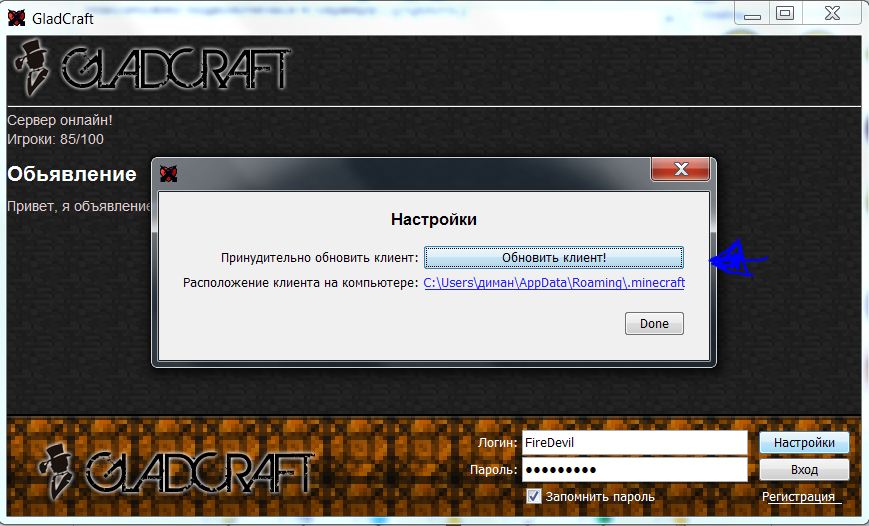 1. Запускаешь Лаунчер Вложение 48338 2. Заходишь в настройки и нажимаешь обновить клиент Вложение 48339 3. Пишет что клиент будет обновлён Вложение 48340 4. Закрываешь настройки, и входишь под своим логином и паролем Вложение 48341 5. Вылезет вопрос "Обновить клиент сейчас?"(или что-то вроде этого, нажимаешь ДА! *скрина нет* 6. Клиент начнёт обновляться. Жди, пока полностью не обновиться, он может тебе показаться что стоит на месте, но это не так, он будет обновляться. Жди... жди... жди... Вложение 48342 |
