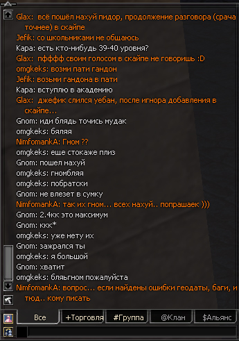 Полный прожим Полный донат Набора нет, тем не менее, возможны исключения. Каждая заявка рассматривается в исключительном порядке. elite1 ---------- Post added at 14:04 ---------- Previous post was at 13:38 ---------- Итак, у нас появился первый враг на сервере - клан equinox, чей представитель вероломно атаковал добродушного Джефа в чате. Как только мы увидели скайп сего господина, Советом Старейшин нашего клана немедленно было принято решение об объявлении войны, так как мы против фашизма, курения, алкоголя, наркотиков и мужеложества. http://www.imageup.ru/img248/957560/bezymyannyjj.jpg |