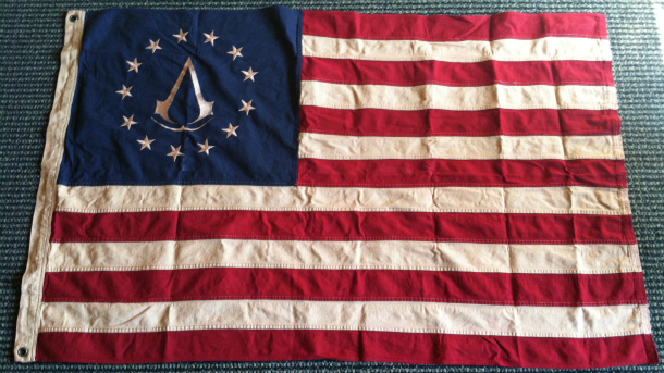 Ubisoft пообещали, что в День Независимости США - 4 июля они опубликуют новый трейлер ожидаемого Assasin's Creed III. А на днях они разослали разным игровым порталам подарки, например Gamеinformer'у достался флаг ассасина (фото ниже). От обычного американского флага его отличает количество звезд (во время объявления независимости было именно столько шататов) и конечно же, знак ассасинов в центре.