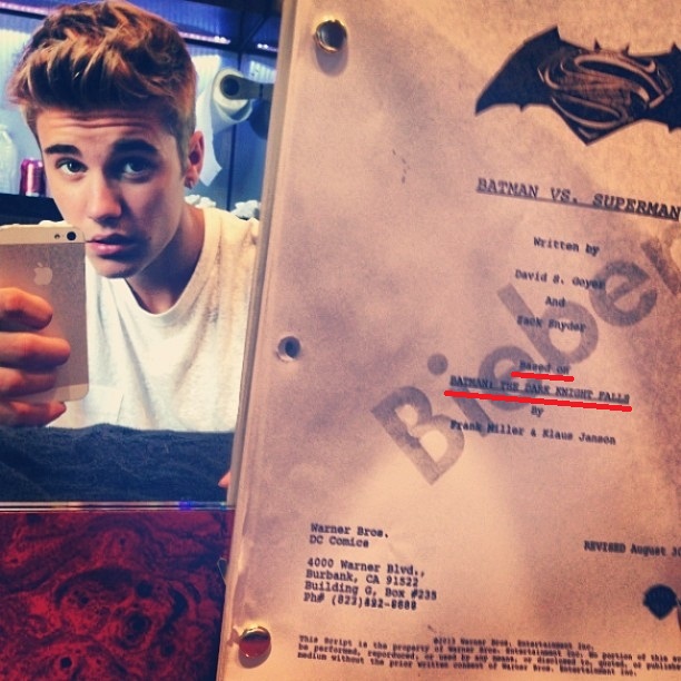 На обложке сценария написано: Based on Frank Miller's The Dark Knight Falls. Те, кто читали комиксы про Бэтмена, знают, что в данном четырёхсерийном комиксе, Робин - это тринадцатилетняя девочка Кэрри. Если это правда, то Бибер наконец-то сыграет самого себя.