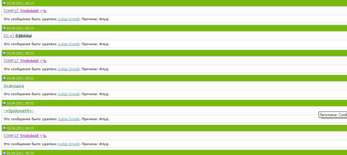 Но не как у ТСА,в первых 25 постах каждый 3-4 был. Одно дело,когда флудят так,что в сообщениях есть смысл. Другое дело - простой и окрытый флуд. |