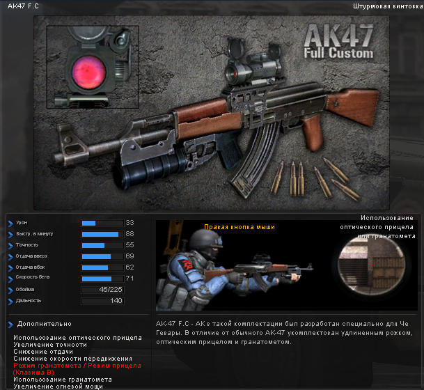 Итак, рассмотрим более подробного "Калаш Че Гевары" Я не буду его сравнивать с другими калашами так как не вижу в этом смысла. Данный ствол чистая имба в своем жанре. То есть поиграв с ним я понял, что убойная мощь + офигенный прицел и возможнность ушатать противника с гранатомета сделает меня не то что Че Геварой, но и Терминатор тут отдыхать будет. Если бы у Че реально был такой калаш, то властелином мира был именно он. Так же с данным "устройством" смерти мне показалось что отдача в разы меньше чем у других. В общем просто я влюбился в данный ствол. Плюс к этому дается второстепенное оружие в виде IMI UZI 9mm Пушка чем то мне напоминает глок, настолько быстрая скорострельность плюс ко всему некое необъяснимое удобство стрельбы и ты король когда у калаша вдруг кончаются патроны, если такое вообще возможно. Я на самом деле уже завидую Че Геваре, ибо имея такой узик пристегнутый к трусам можно месяца три отстреливаться с балкона во время революции. Эх Счастливый был человек Че... Так же в комплекте идет Берет со скрещенными ножами... Вот это я считаю самым интересным девайсом, помимо того, что его можно носить вместе со шлемом, так еще он нехило так прибавляет к скорости перезарядки (для штурмовых винтовок и автоматов), а так же к атаке и скорости. То есть представьте, что вы такой крутой отец, несете добро и свет в массы и при том крушите карты и все живое на них за один миг. Тема отличная. Помимо этого в комплекте валяется: Комплект усиленных шлемов и 12 500 очков... 2. Снайперский комплект Че Гевары с золотой звездочкой... Он включает в себя: