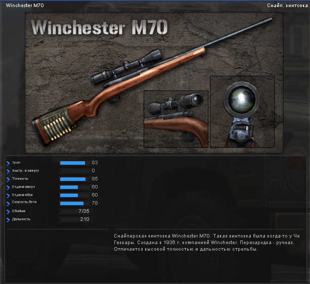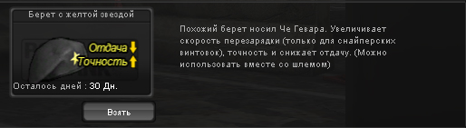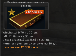 Итак, Winchester M70 Еще одна папская тема. По дамагу проигрывает на пару пунктов "слону" но зато есть пункт скорострельности, получе в отдаче и точности. Прицел как у "слона". Достаточно хорошее оружие для деловых людей. При том она наконец то встает где-то рядом со слоном, обязательно найдет своих поклонников и при том не мало, ибо если судить по статам то ствол аналогичен Слону, то что чуть меньше сносит да и хер бы с ним. Плюс к этому дается второстепенное оружие в виде IMI UZI 9mm О нем я вам писал выше, по этому нет смысла его рассматривать снова, лучше сразу перейдем к берету с желтой звездой: Папский берет Че Гевары на этот раз увеличивает скорость перезарядки но только у снайперских винтовок (ГудХант и АПГ оценят). А так же увеличивает точность и снижает отдачу. В принципе я не знаю насколько критична отдача у снайперов, но вот точность им не повредит, инфа 100%. Дальше как и в прошлом комплекте: Помимо этого в комплекте валяется: Комплект усиленных шлемов и 12 500 очков... 3. Штурмовой комплект Че Гевары с красной звездочкой... Он включает в себя:
