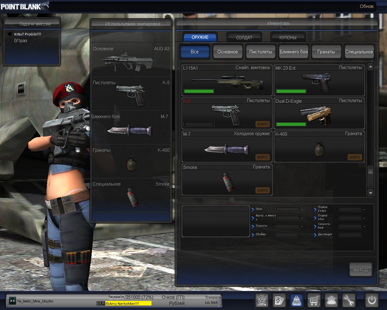Аккаунт в оналайн шутере Point Blank :tratata: Сразу хочу предупредить господа,аккаунт не мой,а моего знакомого и вопросы не ко мне,а к этому молодому человеку в скайп aaron4eg :38: *(добавляйте в скайп с припиской "куплю акк" он добавит вас когда ему будет удобно)На акке ПО ни разу не включались (в бане соответственно тоже не был :dobriychel: ) Вложение 24923 Скажу что доната нету,просто парень уже 4 месяца не играет!:26: (ебАный WoT забирает души хороших играков! :4: ) Вот стата,бои,побеги(на самом деле это не побеги,а сколько раз он дрочил во время кв!!!foreveralone) ![]() А тут дорогие мои "оружка":byuuu: ![]() Теперь Гламурные шЛюпки и летние наряды :atomicchel: ![]() Скилы и няшКи :omsklolo: ![]() А теперь Дамы и господа Самый сок :30: ![]() Приблизительная цена 1500-2000 (можно скинуть,но общаться по этому поводу с самим владельцем в скайпе!) Ну дорогие мои Аппайте тему и Жмите спасибки и поржать! (надеюсь все понимают что я презираю эту поебень):animegvno: |