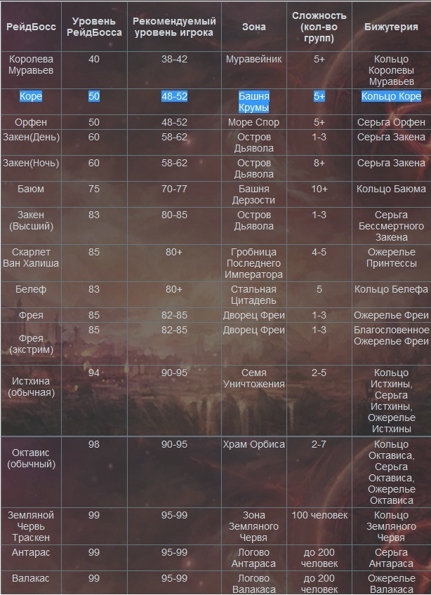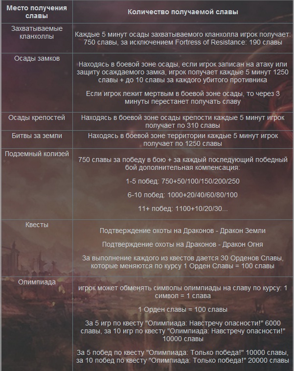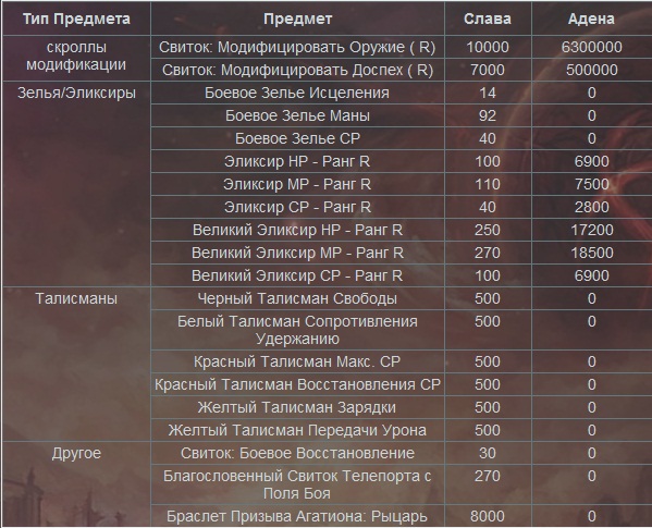Так же в обновлении будет расширен список рейдбоссов, с которых "падает" бижутерия, которая может быть выставленна на аукцион, или улучшенна с помощью "бутылки душой рейдбосса" Слава, которую можно будет получить в боевой зоне осады, крепости, территориальных войнах и Великой олимпиаде можно будет обменять на различные "ПвП - плюшки", или приобрести тот, или иной товар. Славу может получить любой, кто достиг 40 лвл и получил 2 - ю профессию. Были введены новые краски и татуировки перерождённым персонажам, которые можно будет приобрести за адены, славу, и рыцарские эполеты. Далее представляю вашему вниманию список описаний и цен. Описание бижутерии. Кольцо. Вложение 28577 Ожерелье. Вложение 28578 Серьга. Вложение 28579 ПВП вставка в броню. Вложение 28580 ПВП вставка в оружие. Вложение 28581 Цены на перемещения. Слуги Гермункуса. Зоны 85+. Вложение 28585 Расходные материалы. Вложение 28582 П.С. Посты, не относящиеся к теме, а так же "первый нах" и прочее говно будут тереться. |