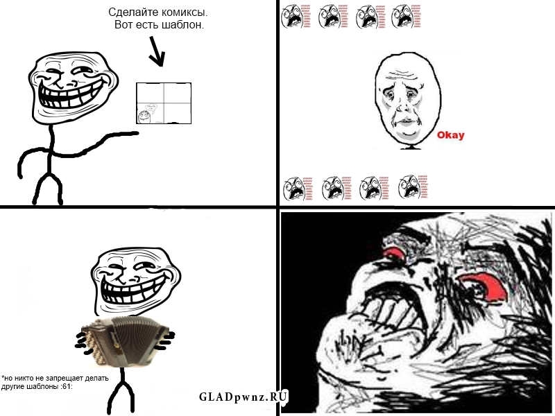 Вложение 29408 Все вы уже , наверняка, стопицот раз видели самые разнообразные комиксы в интернетах. Фу фейс, троллфейс и прочая лабуда то и дело радуют нас , а иногда даже вызывают истеричный смех)Дарова , пацаны! У нас на портале все чаще и чаще начали появляться подборки подобного рода и это просто замечательно . Но увы не всегда получается уследить за последними новостями и люди выкладывают то же самое "по второму кругу" из-за чего получают в щи гнилыми помидорами и тухлыми яйцами. Но давайте сделаем так что бы никто не мог больше сказать "А это я уже видел"... "А это хуйня" ... "Это баян".. Что же мы предлагаем!? У нас есть своя заготовка (шаблон) под комиксы. Мы предлагаем вам принять участие в конкурсе на лучшие комиксы и получить уникальные награды. Так что если вы неебатый отец пайнта и у вас просто хуева туча для комиксов - беритесь за свою нигабаторскую Х7 и начинайте пилить свои шедевры! Лучшие работы в конце года будут выставлены на голосование в номинации Comic'sMaker 2011 Заготовка Вложение 29403 Несколько примеров работ ![]() ![]() ![]() ![]() UPDATE Кстати никто не запрещал использовать свои шаблоны :61: Но не забывайте дописывать GLADpwnz.RU Вложение 29450 |