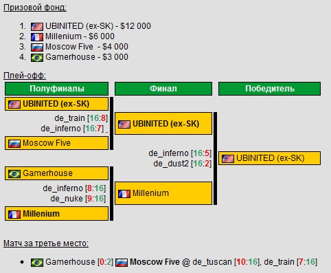 ESWC На чемпионат мира в Париже съехались лучшие игроки по таким дисциплинам как Counter-Strike: 1.6 male/female, Counter-Strike: Source, Dota 2, FIFA 2011, TrackMania Nations Forever и Starcraft II: Wings of Liberty. Интересный факт: многих кибератлетов разместили в отеле Etap в неблагоприятном районе города (где стоит заметить проводил бессонную ночь и автор этой статьи, знакомясь с тонким ароматом французского пластилина), и страх перед шатающими трубы афрофранцузами был настолько велик, что никто не посмел выйти хотя бы за семками в близлежайший ларёк. Counter-Strike: 1.6 На турнире участвовали три лучшие команды СНГ - Na'Vi, DTS и MoscowFive. Планы у всех трёх были наполеоновские (топ3 для дтс и москвичей и естественно топ1 для Рождённых побеждать). Главной интригой довольно скучного группового этапа стал как раз матч М5-DTS, победитель которого обеспечивал себе выход в плей-офф со второго места, т.к. победить набравших великолепную форму SK не представлялось посильным. ДТС, обыгрывающие М5 в 9 лановых играх из 10 на этот раз не смогли переиграть главную надежду России и как результат- начали паковать вещи в их первый же игровой день. М5, кредит доверия к которым уже был исчерпан, после очередной пьянки на недавно проходившем чемпионате Европы от Samsung'a, доказали, что могут, когда трезвые, но как всегда не прыгнули выше головы- проигрыш 13-16 от СК в группе и 1-2 по картам в 1/4 финала от Na'Vi и очередной топ5-8. Na'Vi, после продолжительного спада казалось бы набрали былую форму и готовы карать всех и вся, и довольно лёгкая победа над поляками AGAiN только укрепила веру в это. Но, к всеобщему сожалению, чемпионы ESWC 2010 не смогли справится с натиском шведов и заняли 2 место, отлетев от всё тех же SK 0-2 по картам. Counter-Strike: 1.6 female Женский контрстрайк- безжалостный и беспощадный. 60 девушек из 12 команд в течении 2 дней боролись за звание самой самой. Не может не радовать тот факт, что наши девчёнки из M5 являлись одними из фавориток турнира, но вот поделать с доминированием американок UBINITED (ex-SK) никто ничего не может. Проехавшись по россиянкам в полуфинале, в финале ими были обыграны хозяйки чемпината- француженки из Millenium с ещё большим счётом. Но бронза всё таки досталась москвичкам, с чем мы их и поздравляем. cs:male cs:female Dota 2 Показав всем кузькину мать на первом чемпионате по дота 2 и выиграв целый миллион долларов США, украинско-российско-эстонский состав Na'Vi продолжил своё доминирование и, выйдя из группы со 2 места они как по нотам обыграли в полуфинале сербов, ну а в финале встретелись со своими обидчиками с ESWC 2010- китайской командой EHOME и действующими чемпионами по дота1. К всеобщему разочарованию, интересной игры не получилось и китайцы были обыграны на удивление быстро 2-0 по картам. М5 к сожалению, уступив в групповом этапе вышеупомянутым китайцам и датчанам Monkey Business, так и не смогли выйти из группы. Starcraft II: Wings of Liberty Больше всего сюрпризов нас ждало именно в этой дисциплине. Сразу 6 прогеймеров из СНГ- украинцы Alf и Strelok, россияне LiveZerg, Pomi, sLivkо и белорус LoWeLy отправились защищать честь Советов. Но, как вы видите, это далеко не лучшие представители своих стран и как результат- только LiveZerg смог преодолеть групповой этап. А на стадии плей-офф в 1-ом же туре его ждал один из главных фаворитов чемпионата- анманерный американец Idra. Все сулили ему лёгку победу, так сказать разминку...но LiveZerg сенсационно вырвал победу из длиннющих лап капиталиста 2-1 по картам (и по
