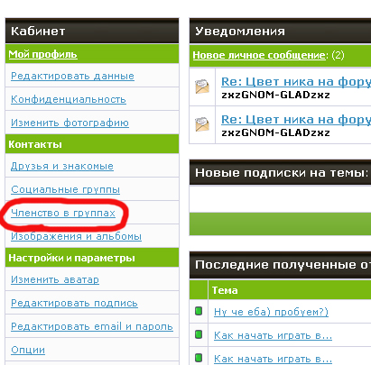 В любой момент вы можете вернуть свою предыдущую группу. На данный момент у нас 3 публичные группы: 1. По игре PointBlank : http://gladpwnz.ru/1/pb.png 2. По игре Lineage 2 : http://gladpwnz.ru/1/lineage2.png 3. По игре A.V.A - Alliance of Valiant Arms: http://gladpwnz.ru/1/ava.png 4. Пользователь играющий на Корейских серверах в соответствующие игры: http://gladpwnz.ru/1/koreangamer.png 5. Пользователь форума, играющий в Оффлайн игры: http://gladpwnz.ru/1/offlinegame.png 6. Пользователь форума играющий в Онлайн игры, которым не достались собственные подразделы и группы: http://gladpwnz.ru/1/onlinegame.png 7. Просто пизданутый флудер :) http://gladpwnz.ru/1/flooder.png 8. Игрок CrossFire http://gladpwnz.ru/1/337809b5d57d.jpg 9. Игрок World Of Tanks : http://gladpwnz.ru/1/wot.png 10. Анимэшник: http://gladpwnz.ru/1/anime.png ДЛЯ ТОГО, ЧТО БЫ ВИДЕТЬ ИЗОБРАЖЕНИЯ ГРУПП НЕОБХОДИМО ВЫБРОСИТЬ БРАУЗЕР-ОПЕРУ, ИБО ОНА ПНГ ТУТ НЕ ВИДИТ. Для того, что бы вступить в какую-либо группу вам надо: 1. Вверху страницы найти "Мой кабинет" и нажать на него: Вложение 1582 2. После чего вы окажитесь в своем кабинете, где слева в меню находите раздел "Контакты" и в нем подпункт "Членство в группах", жмете на него: Вложение 1583 3. Далее вы попадете на страничку со списком групп, где показано в каких группах вы состоите, а в какие группы можете вступить, далее в самом верху ищите список групп с заголовком: "Вы можете вступить в следующие группы пользователей", где напротив интересующей вас группы вы ставите галку на "Вступить" и жмете кнопку снизу "Вступить": Вложение 1584 4. После чего страничка обновиться и перед вами будет список групп в которых вы состоите, что бы на форуме вы отображались в той или иной группе, ее надо активировать, для этого в заголовке "Вы можете выбрать, членом какой группы вы будете являться" напротив нужной группы ставите галку и жмете "обновить": Вложение 1585 5. После чего вы будете отображаться на форуме относительной данной группы: Вложение 1586 Если появятся новые группы то я объявлю об этом здесь. Если есть какие либо пожелания то отписывайте. |