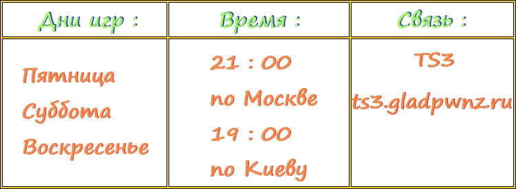Это расписание официальных игр(для того что бы велся топ gladpwnz и время было подобрано для работающих/учащихся людей),если есть желание поиграть сыграть среди недели отписывай в теме>собирай народ(тут я не причем,от меня ничего не зависит,все сами)