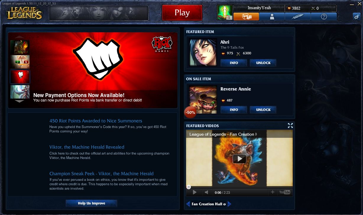Вложение 36824 Алоха, саммонеры. Сегодняшний небольшой новостной блоr не планировался, но так как меня попросили, я решил рассказать вам о нескольких довольно интересных новостях, связанным исключительно с Riot Points. Итак, поехали! 1) 450 Riot Points Awarded to Nice Summoners С ранней весны, мы с риотами работали в Трибунале чтобы выявить саммонеров, которые убивали наши с вами игры. И не напрасно. Счастливчиков, которые небыли в бане последние 2 месяца и которые старше 6-го левела, ожидает награда в 450 RP которые будут начислены до 28-го декабря включительно. Так же Риоты обещают, что подобным образом они будут в дальнейшем ещё поощрять активных и честных игроков RPхами. 2) Receive a 300 RP Bonus with a Riot Points Purchase! Риоты так же хотят сделать подарок, для людей, материально поддерживающих их проект, и поэтому до полуночи 9-го января, при покупке любого количества RP, вы получите единовременный бонус в виде 300 RP. Мелочь, но RP лишними не бывают, поэтому если вы хотели на новый год порадовать себя поинтами, то сейчас самое время. 3) Баг при покупке RP через Direct Debit. Риоты добавили ещё один вид покупки поинтов под названием Direct Debit. На Исте его пока нету, поэтому пробуйте на других серверах. Если у вас его нету - можете даже не пытаться. Что вам будет за этот способ - я сказать не могу. Вы можете быть забанены, к вам могут прийти дяди с дубинками или ещё что нибудь. Поэтому делайте это исключительно на свой страх и риск. Но кому интересно, я поведаю этот способ. П.С. За баг передаём спасибо Дизе. - Заходите в игровой магазин - жмёте купить RP - выбираете например Нидерланды - выбираете способ Direct Debit - выбираете пак на 20 евро - заполняете все поля произвольными словами - индекс вводите цифрами - в поле аккаунт намбер пишите любые 4 цифры - жмёте order details - ещё раз order - наслаждаетесь халявными кулачками Пруф: Вложение 36833 |