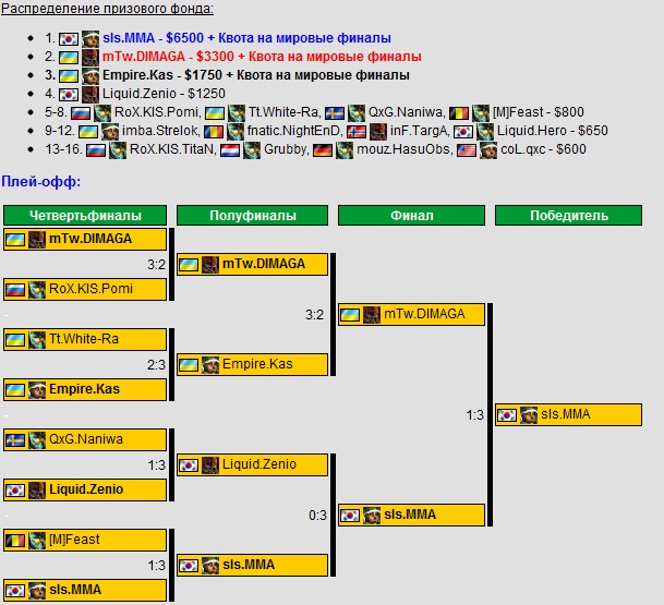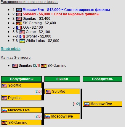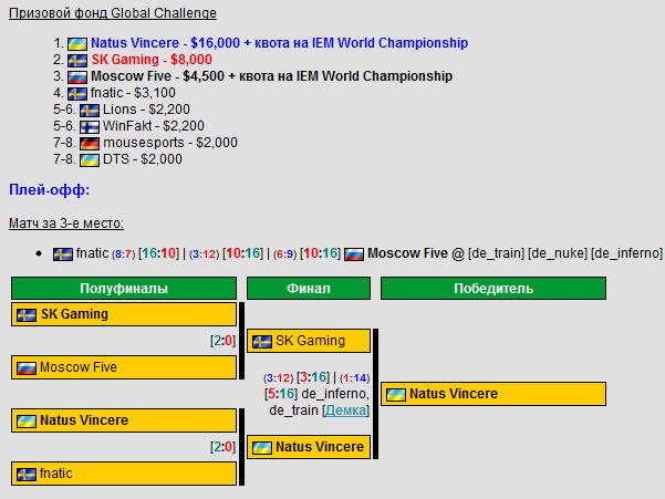 Женский киберспорт явление весьма специфическое, и единственная игра где существует достаточное количество про- и полупро команд это counter strike 1.6. К сожалению, единственным крупным турниром в женском ксе оставался парижский ESWC. Но ситуацию решил исправить Rockstar Female World Cup, который 14-15 января собрал в Стокгольмской киберспортивной арене лучшие команды мира. Покорять Швецию отправились и наши девушки из Вложение 40846M5 Female. Выйдя из группы со 2-го места, уступив лишь немецкой пятёрке Вложение 40844ALTERNATE, Son1a и компания учинили разгром в стадии плей офф. Сначала отправились домой топ2 мира по версии ESWC 2011 француженки Вложение 40845Millenium, а в финале был взят реванш у ALTERNATE. Первое место за М5 Female и 5,625 € заслуженно отправляются в Москву. Ну что ж, непобеждёнными остались только бесспорные топ1 мира- американки, выступавшие за Вложение 40850SK (ныне без спонсорской поддержки). hltv.org так же порадовал нас в январе. Во первых, был представлен топ10 фрагов 2011 года http://www.youtube.com/watch?v=ZATkG...ure=plpp_video А fragbite.se показали топ5 самых курьёзных моментов 2011 года http://www.youtube.com/watch?v=QcPeWyVW0fQ Ну и во вторых, в течении 2-ух недель админы выкладывали список топ20 игроков последних 12 месяцев, в который попали 3 игрока Вложение 40851Na'Vi и 2 Вложение 40846MoscowFive. Прочитать полную версию статьи и подробно ознакомиться с рейтингами каждого игрока вы можете здесь. Ну и наконец, буквально только что завершился первый турнир от ESL в этом году- ESL IEM Global Challenge Kiev, проходивший в течении последних 3 дней в Киев Киберспорт Арене. Всего было 3 дисциплины- Counter Strike 1.6, Starcraft 2 и LeagueOfLegends. http://www.youtube.com/watch?v=RPAkAmvwJvM Counter Strike 1.6 IEM Kiev вполне заслуженно можно было назвать чемпионатом Европы по ксу, ведь его посетил практически весь топ, за исключением конечно 3-ёх кратных чемпионов мира по версии WCG поляков Вложение 40853ESC. Две группы по 4 команды, практически каждый матч был очень зрелищным и непредсказуемым. И даже не смотря на то что ксу больше 11 лет, на турнире мы увидели несколько новых фишек вроде тройной башни на тускане. После группового этапа определился топ4- Вложение 40847SK, Вложение 40851Na'Vi, Вложение 40847fnatic и Вложение 40846M5. А учитывая то, что обе шведские команды уже имели квоты на мировые финалы, НаВи и М5 уже тогда обеспечили себе поездку на финальный турнир в Ганновер. Но естественно мотивацию это у них никак не отбило. Рождённые побеждать в 1/2 обыгрывают фнатиков 2-0 по картам (оба раза 16-11). Ну а М5 как всегда демонстрируют равную игру с СК и опять им немного не хватает (17-21; 10-16). Сразу после полуфиналов прошёл матч за 3-е место, где М5 на 3-ёх картах всё таки вырвали победу у фнатиков и заняли второе 3-ье место на последних двух крупнейших турнирах, окончательно доказав своё место в топе. Финал же обещал быть очень интересным, с допами, с играми на 3-ёх картах, с долгими тайм аутами...но похоже у НаВи было другое мнение по этому поводу, и в итоге всего лишь за час они раскатали грозных шведов 2-0 по картам со счётом 16-3; 16-5. Так СК уже ооочень давно никто не обыгрывал, и пацаны на минус морали отправятся домой анализировать свои ошибки. Starcraft 2 Не менее интересными были игры по старкрафту, где из 16 игроков 4 было из Украины (Вложение 40851White-Ra, Вложение 40851Strelok, Вложение 40851Kas, Вложение 40851DIMAGA) и 2 из России (Вложение 40846Titan, Вложение 40846Pomi). Групповой этап преодолели 4 из них, и, к сожалению, а может и к счастью, сетка распределила их таким образом, что в 1/4