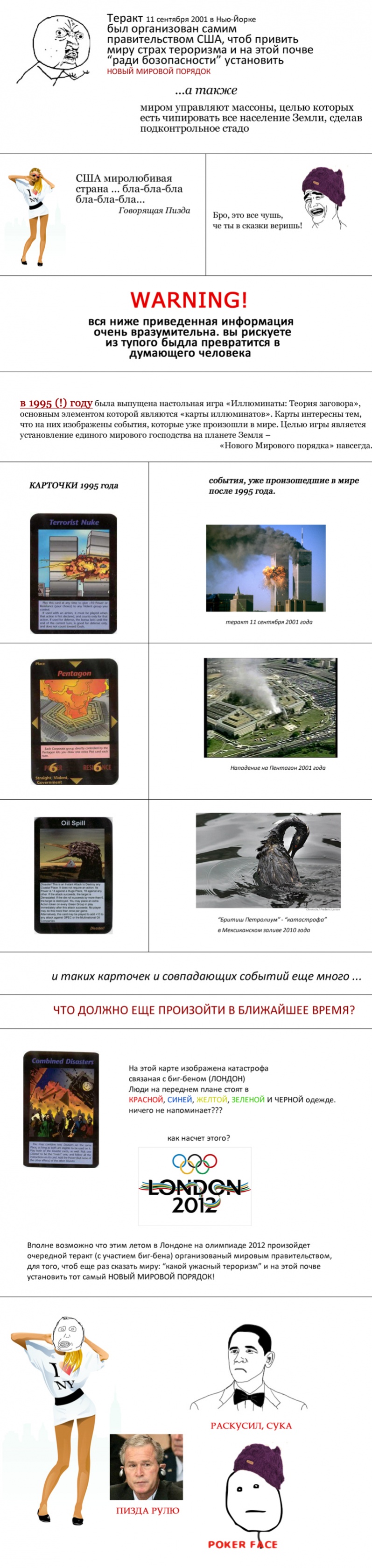 Да и плюс ко всем, предсказать катастрофы и террористические акты ума большого не надо. Это всегда было и будет, а карточки эти их сам КЭП создал, так как в них описываются очень очевидные события. Эти карточки и кнИги "Иллюминаты" просто лохотрон, на популярную в то время тему МИРОВОГО ЗАГОВОРА, чтоб с лохов деньжат срубить. |