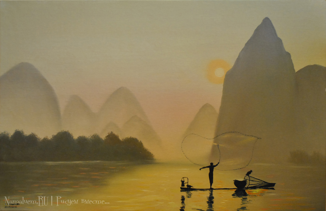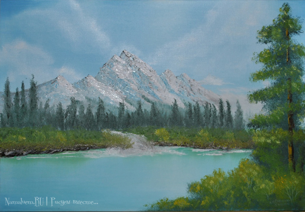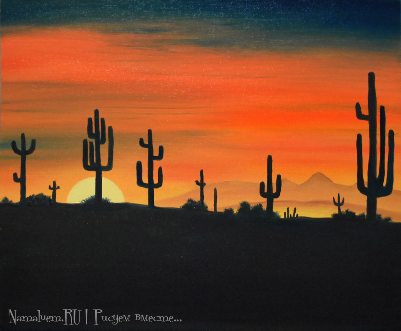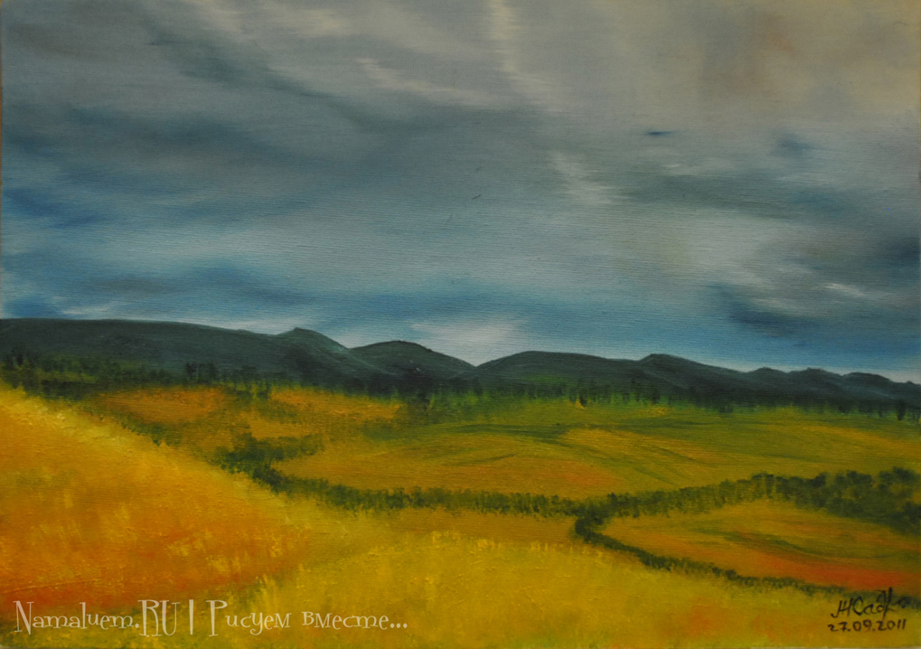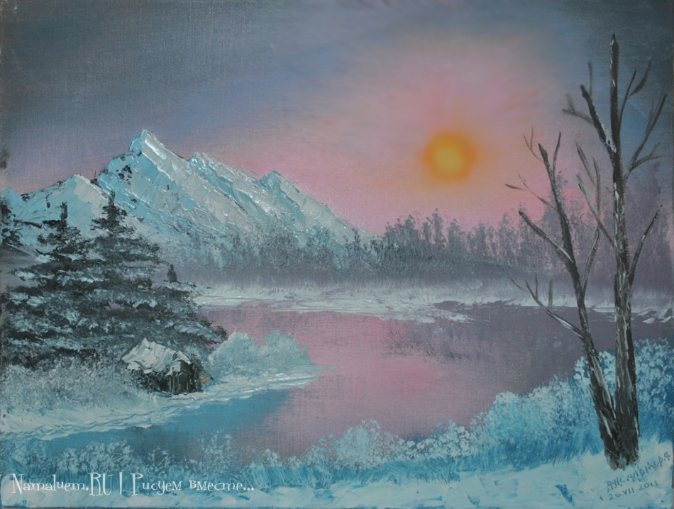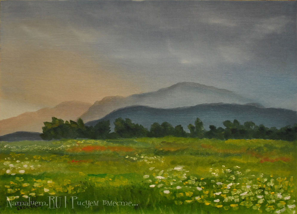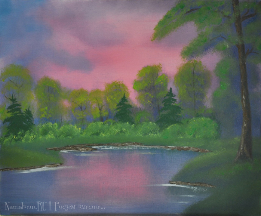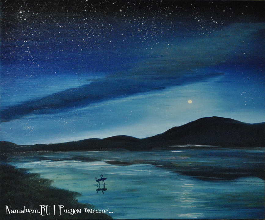 Гора, поле, водоем, луна, закат/восход, птичка. Выбрать желаемое, нарисовать. В галерее ничего интересного, видео не смотрел - буду дома, тогда и гляну.