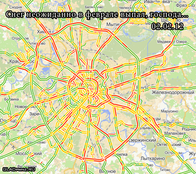 По всей Москве и округе пробки. Зеленые линии-дороги свободные. Желтые линии-движение осложнено Красные линии-пробки, движение стоит. И все из-за внезапного снегопада 2 февраля. |