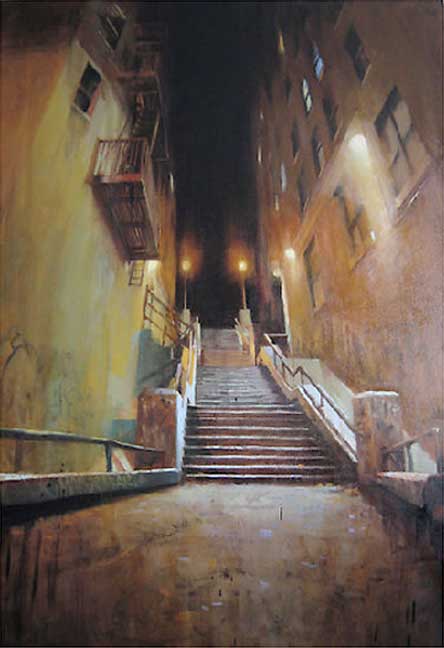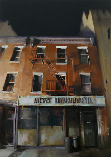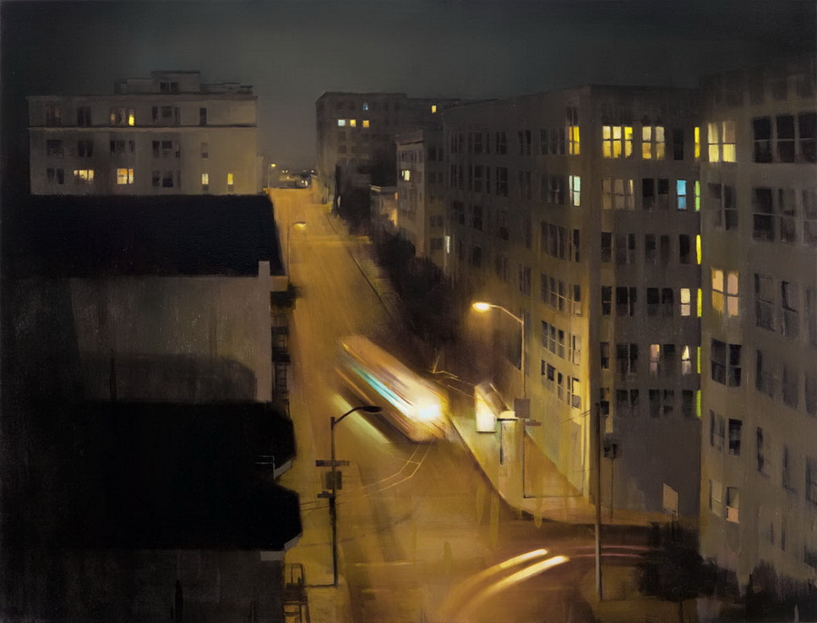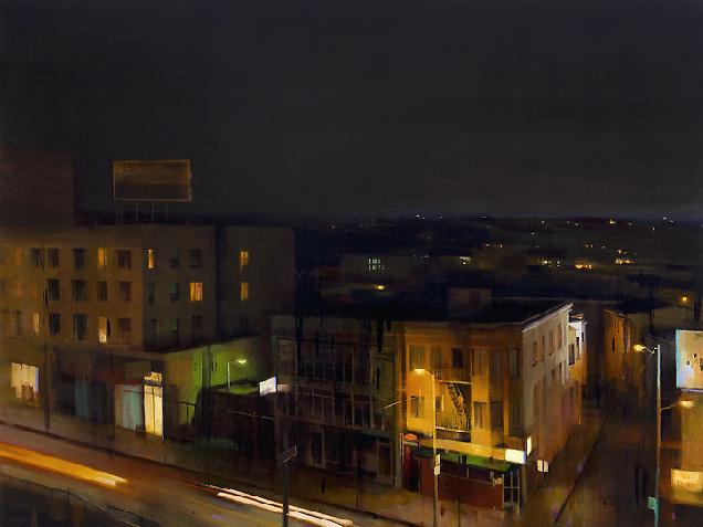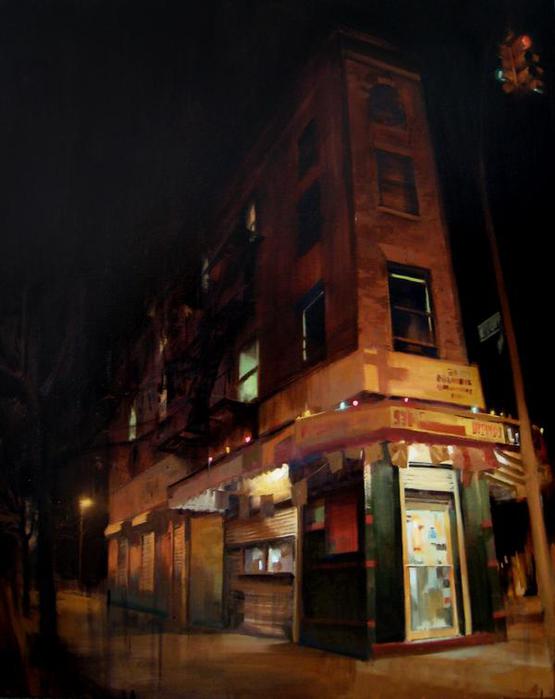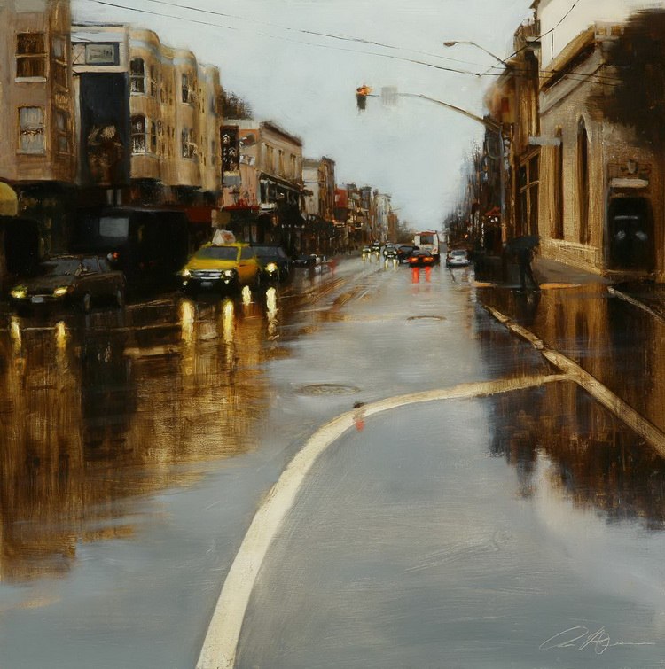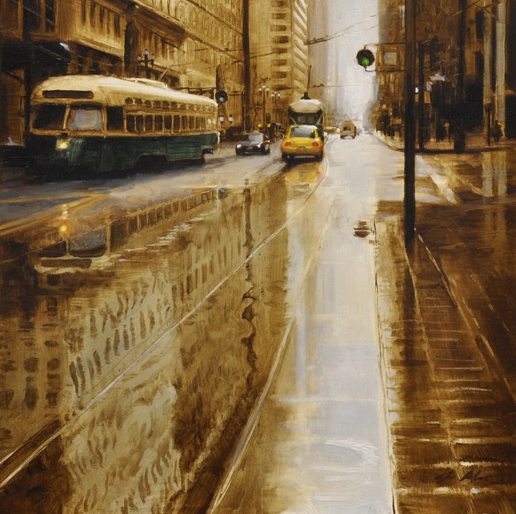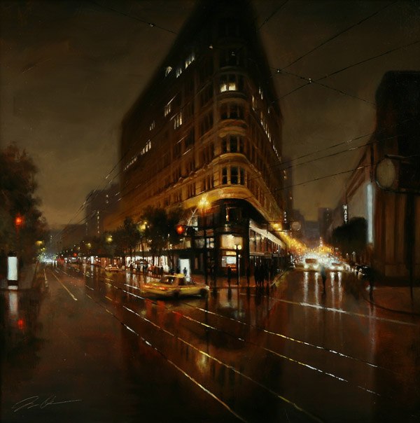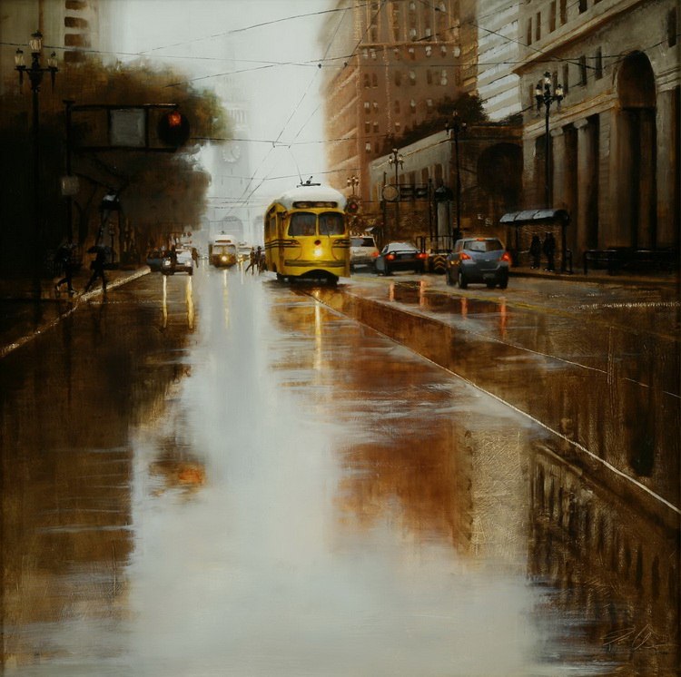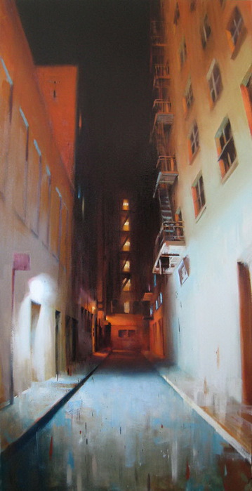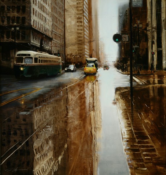 Если предыдущие художники представляют нам город в ярких позитивных красках, то тут сплошной реализм. Город - какой он есть... Шедеврально передана атмосфера. Заметьте, улицы пусты, что навевает еще более мрачные ощущения.
