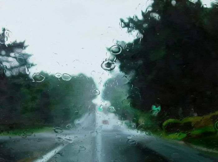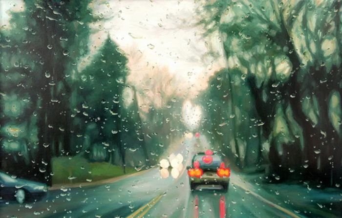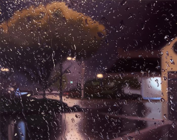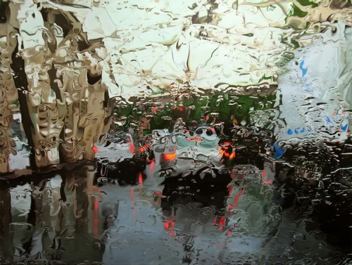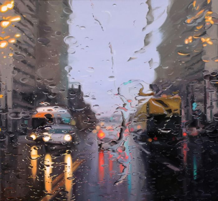 "Дождливые пейзажи". Смотрите, и учтите, что это не фотошоп и фотография где за не хуй делать можно натянуть такую хуйню. Просто представьте - перед вами холст, из "оружия" у вас только кисть и краски, и вам нужно так передать капли воды на переднем плане, что бы за ними граммотно в композицию вливался пейзаж, думаю комментарии излишни.
