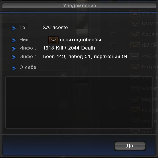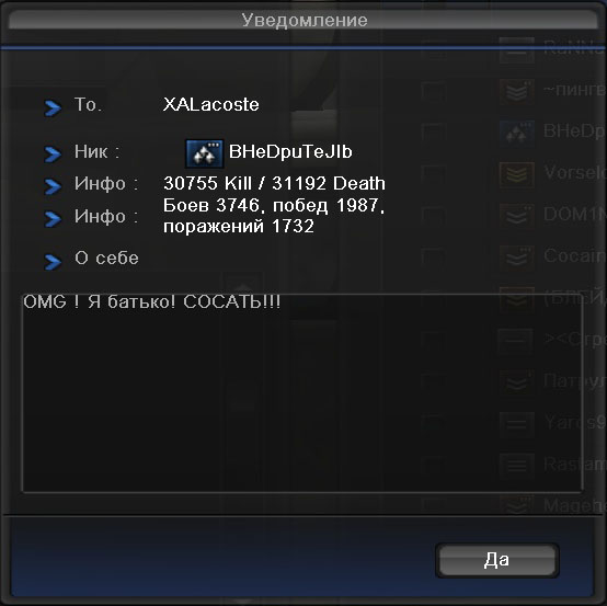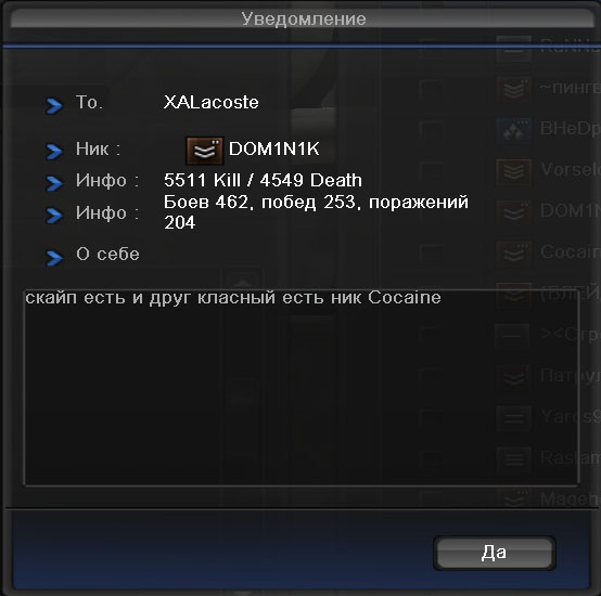 Немного порыскал по скринам в папке ПБ и нашел немного маразма за небольшой промежуток времени, относящегося к нашему клану XALacoste, так как в основном все диалоги проходили перед кв или после, плюс к этому хотелось бы показать вам, кто к нам постоянно стучится, точнее каким примерно заявки подают)