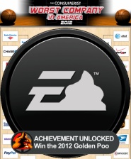 Доброго времени суток, гладиаторы. Свершилось то, чего так ждала определенная публика игроков. В США ежегодно среди потребителей (в смысле потребителей вообще всего) проводится опрос по поводу компании, которая является худшей. На сей раз такого несомненно авторитетного звания удостоилась наша любимая компания Electronic Arts. Интересно, то ЕА вышла в лидеры с огромным отрывом аж в 64%! Основным конкурентом в голосовании была компания Finalist Bank of America, набравшая 36%. Аплодируем и поздравляем ЕА с наградой "Золотая какашка 2012". Всеобщая ненависть общества к ЕА вызвана самыми разными причинами. Кто-то недоволен их продукцией, кого-то не устраивают их методы и прочее...