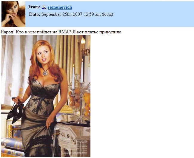 RMA-MTV Russia Music Awards. Это хуевое событие от МТВ проходит раз в год, там вручают премии за всякую поеботу, например, лучшая певица, открытие года и так далее. Вся наша русская сцена.. весь наш российский шоубизнес во главе с Педросовичем приезжают на вручение RMA. И конечно же все эти интелектуалы, перед вручением думают, что же блять на себя нацепить, чтобы быть самым(ой) пиздатным?