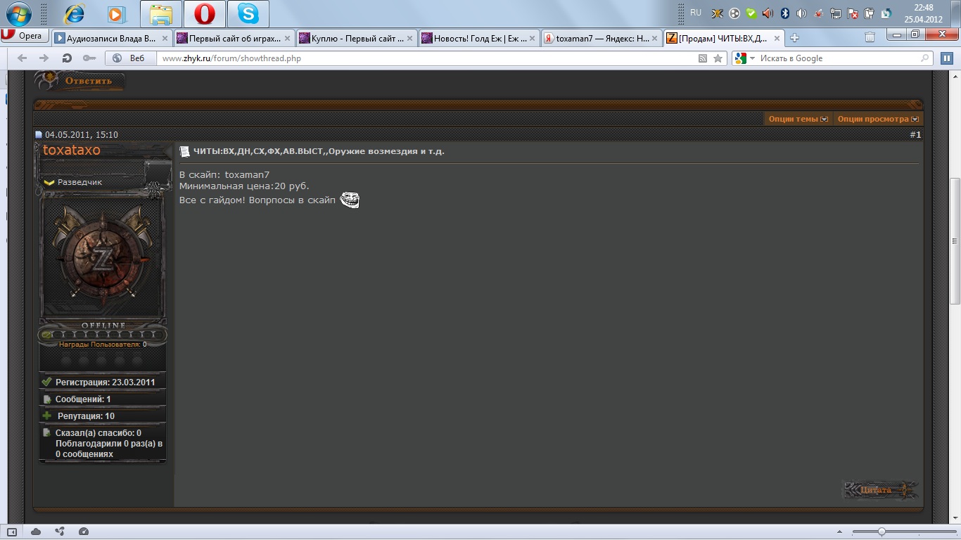Помощники у меня были на разных проектах. Год назад? Пораньше нельзя было? 2010? Не? Акк № 48 продан. |