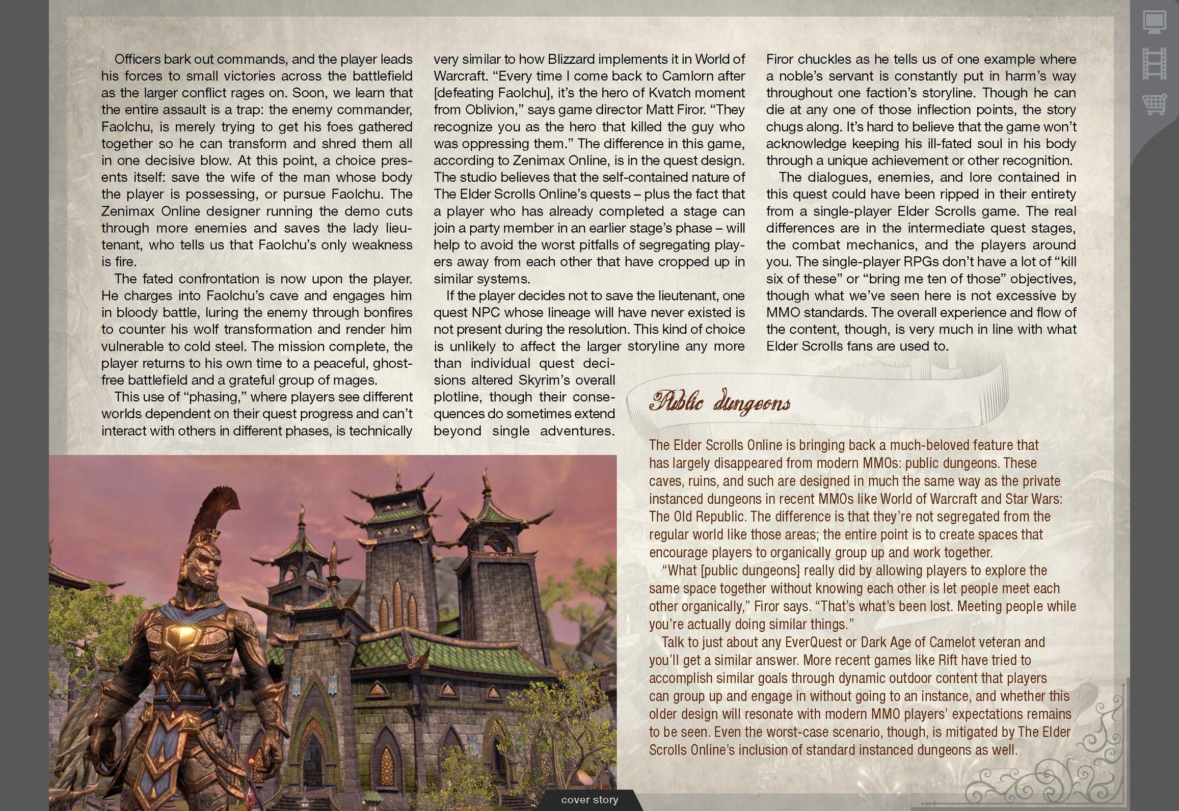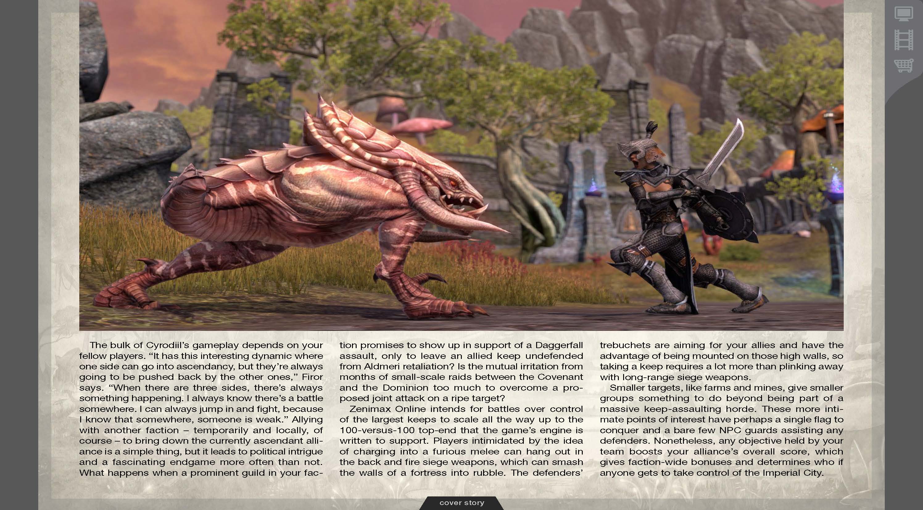 Доброго времени суток, гладиаторы. В скором времени, возможно, свершится то, чего ждали многие фанаты серии ролевой игры The Elder Scrolls. Сегодня в сети появились первые скриншоты и сканы журнала Gameinformer, на которых описывается мир TES Online. Пол Сейдж, креативный директор компании Zenimax Online, в своем интервью для этого журнала заявил, что они собираются взяться за игру совершенно по новому, в частности - за переход мира игры в mmo-среду. Главная задача разработчиков - аккуратно перенести все, за что так полюбилась эта серия игрокам, все самое лучшее, например, отличную боевую систему и большой и интерактивный мир, наполненный персонажами и всякой нечистью, которые адекватно взаимодействуют с игроком. Цитата: