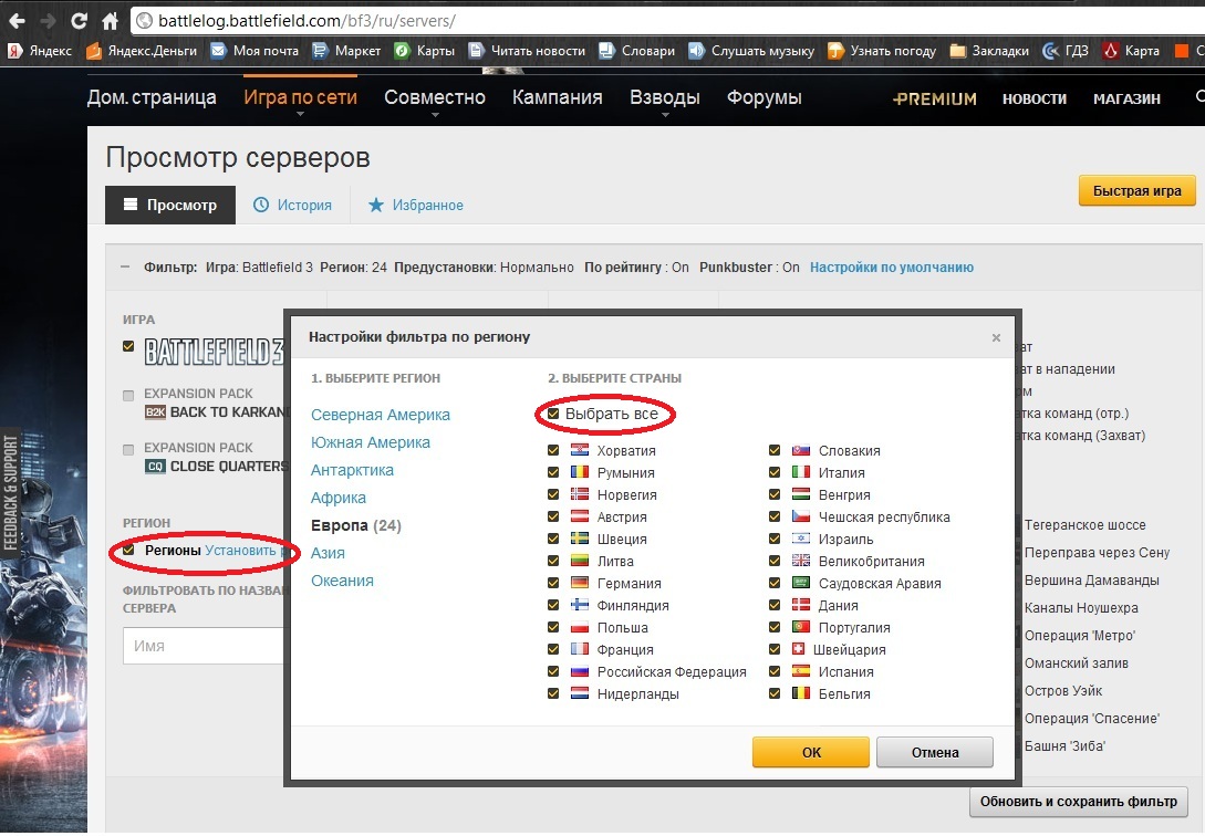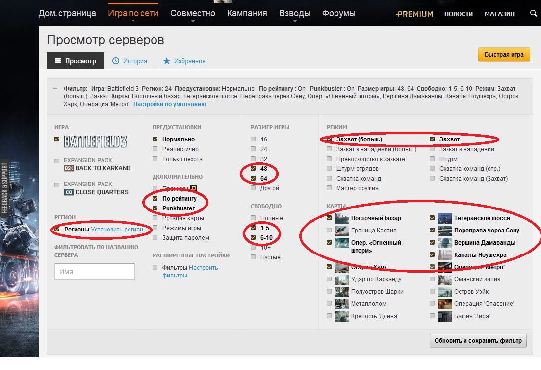 Для начало, чтобы у нас ничего не тормозило не висло установим регионы Европа, не забыв поставить нужные галочки. Дальше делаем установки также как показано на скрин-шоте: Карту "Граница Каспия" я лично сам не рекомендую, т.к. она очень большая, и, мне кажется, вы больше потратите время, чтобы только найти вашего противника на ней. Другие виды боя ЛИЧНО МНОЮ менее предпочтительней, т.к. такие типы боя как Штурм(Штурм отрядов) для более хардкорных игроков, некоторые идут с дополнениями, а на некоторых просто мало кача. Что же, на этом все, ваши и рекомендации оставляйте в комментариях или мне в личку, что было бы предпочтительней. Всем удачной игры, надеюсь для кого-то это был полезный мануал. |