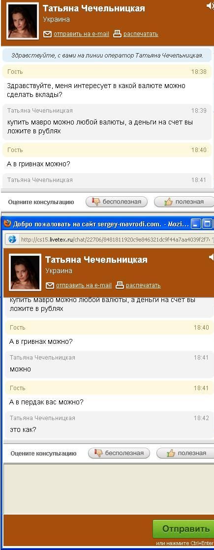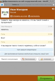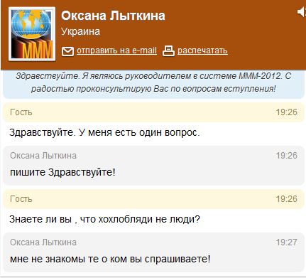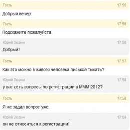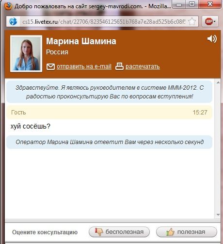Я тут сейчас от души просто поржал, аноны снова сделали вечер небольшой, но очень веселой акцией. Они начали троллить online-консультантов на официальном сайте МмМ (Мавроди) окошко с которыми появляется при заходи на сайт. Сначала они доставали вопросами "вот вы попали в камеру и тут вам предлагают в жопу дать или мать продать". К удивлению очень часто оператор, видимо уже от безысходности, неплохо поддерживал беседу, а иногда тупил, в общем смотрим некоторые переписки этого дела (смотри под спойлером):