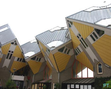 Разрушенный до основания во время Второй мировой войны центр Роттердама, был отстроен заново в самом новейшем архитектурном стиле. В 70-х годах появилась идея построить уникальный квартал, который по архитектуре не был бы похож ни на что вокруг. Датский архитектор Пит Блом в 1984 году воплотил этот замысел в реальность: один из домов этого квартала состоит из кубов, поставленных на ребро. Каждый куб состоит из трех уровней: на первом уровене, имеющем форму треугольника, расположены прихожая, гостиная и кухня, а на втором и третьем уровнях – спальни и ванные комнаты.