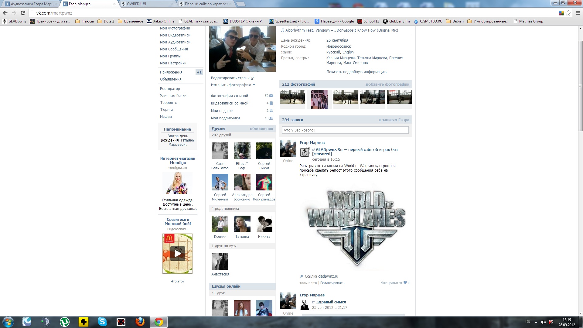 Всё дело в том, что GLADpwnz.ru объявляет о новом эксклюзивном конкурсе на огромную кучу заветных ключиков для World of Warplanes, которая разрабатывается теми же людьми, кто создал популярнейшие World of Tanks, в которые ежедневно заходят более 2-ух миллионов человек! На данный момент там сейчас проходит закрытое бета-тестирование и у вас есть все шансы стать одним из тех первых, кто увидит, возможно, зарождение еще одной хорошей и интересной игры. К тому же, для этого вам не нужно танцевать гопак с хуем в руке рассказывая собственно сочиненный стих, который должен быть лучше чем у Пушкина. Нет, ужно всего лишь оставить заявку в этой теме. Требования очень просты - на своей страничке в "Вконтакте" нужно оставить вот такое сообщение, с таким же текстом и прямой ссылкой на данную тему, чтобы это выглядело примерно так: Вложение 65413 Далее постите скриншот поста в "Вконтакте" сюда и... ждете! Хотелось бы так же напомнить, что недавно зарегистрированным людям нужно сначала "набить" 6 сообщений, иначе посты с ссылкой, например, на фото-хостинг будут висеть в "непроверенных", мы видим такие посты и как только будем тут - проверим их и они появятся, не нужно писать по несколько раз, если ваше сообщение здесь не появилось. Здесь только заявки, флуд, оффтоп и прочее будут караться анальным рабством баллами, вплоть до бана. |