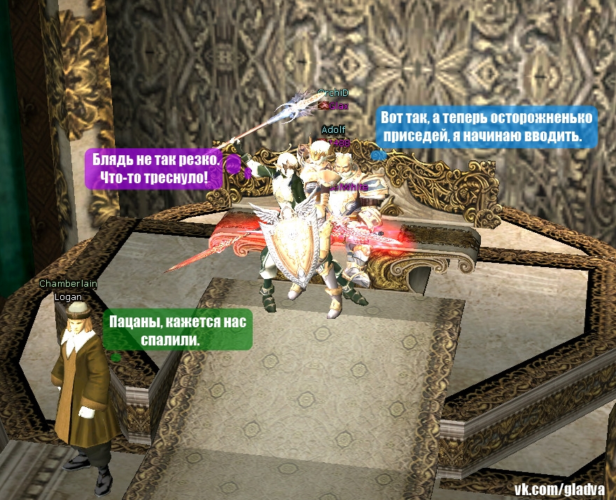 Вчера мы упоролись на отличненько, пробежались с пацанами по Адену, отвесили люлей местным пацанам и закастовали флаг, прикрывая анус товарищей, от злых магов и короля Кадмуса, который, впрочем, не сильно отличался силушкой богатырской и всасывал при первой хорошей возможности =) Сегодня по расписанию должен быть тест квеста на саб, но мы решили, выделить еще один вечер, чтобы окончательно проверить работоспособность замков. Это конечно не так весело, как разборки на уровне "Вась, семки есть?", но сделать надо, ибо важно =) Тестеры сейчас уже выставляют защиту и вечерком мы повеселимся на Адене. Если будет интересно посмотреть, как плачет Глакс и что кричит Кекс, когда его убивае гард, то одевай свой лучший фрак и приходи на сие представление. Сегодня 07.10.2012 ровно в 18-00 по МСК очередной замес возле замка Аден. Присоединяйся и не забывай следить за анонсами в чате. Вступаем в группу GLA2, поддержим проект! |