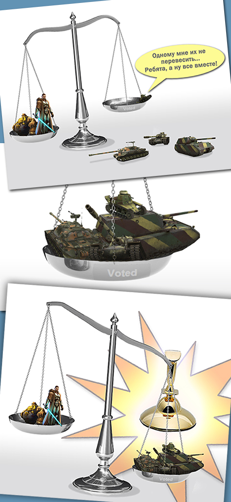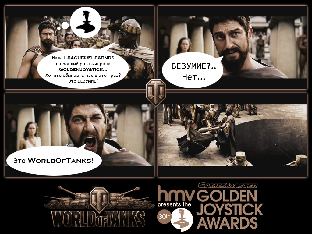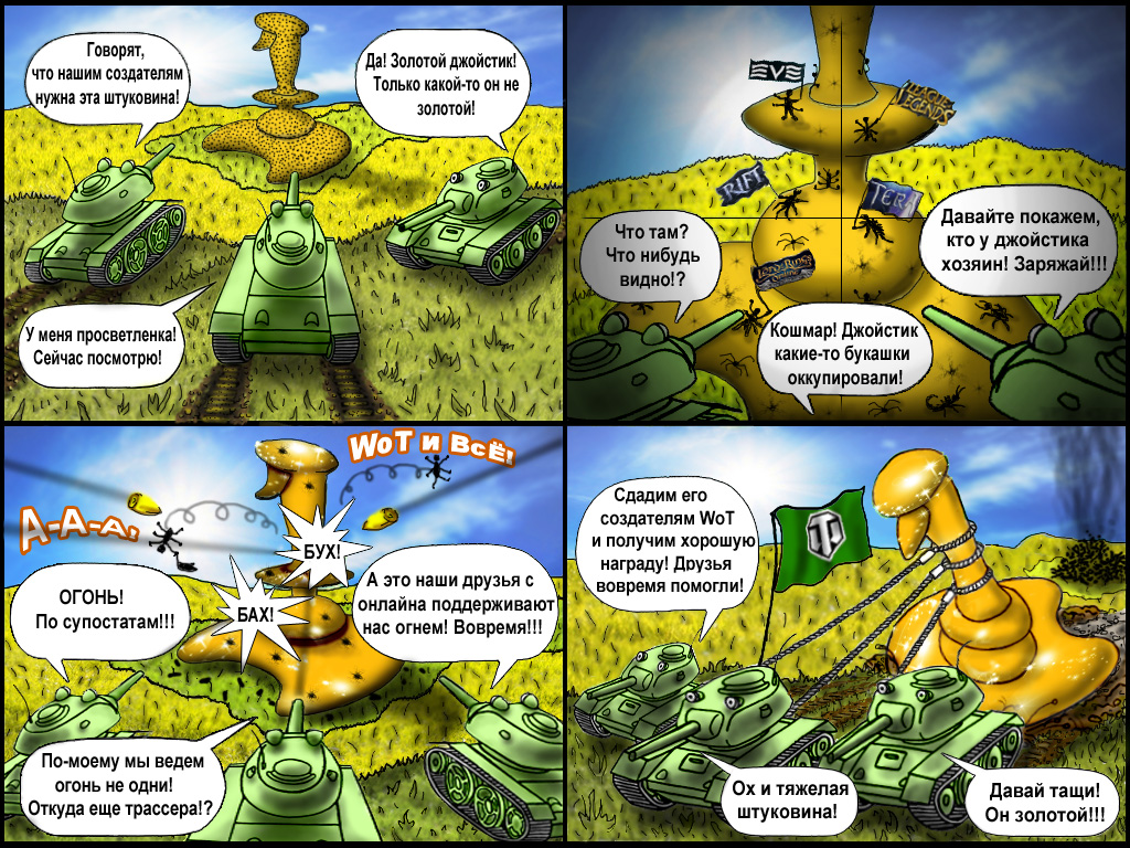Привет вечерним Гладовчанам, двенадцатый выпуск необычный и писал его я, в течении нескольких недель определённые члены команды GladWoT будут писать свои пробные новости, по итогам которых будет выноситься решение об его исключении, либо же об закреплении в команде. Сразу извиняюсь за возможные ошибки, написано с планшета. Итак, сегодня в выпуске: - Golden Joystick. Финал. - Очередная акция. "Перекрёстный огонь". - Руководство для чайников, ELC AMX. - Конкурс "Golden комикс", нарисуй и получи 7000 голды "О Golden Joystick" Как все мы помним, эта акция стартовала еще в сентябре, масштабная акция была развёрнута Варгееями, из каждого чайника было слышно "Голосуй за WoT"! И вот наступил логический финал, 23 октября завершается голосование за лучший проект и наверняка танки в лидирующей позиции и толи это не так, толи Варгееи раздобрели - целых 7 дней длится акция - «Погоня за Golden Joystick»: - пятикратный опыт за первую победу в день на каждом танке; - бонус-код на три дня премиум аккаунта и по 5 комплектов каждого вида премиумного снаряжения (доппаёк, ящик колы, шоколад, крепкий кофе, улучшенный рацион); - скидка 50% на оборудование (досылатели, усиленные приводы наводки и т.д.); - скидка 50% на слоты в ангаре; - скидка 50% на обучение, переобучение экипажа и сброс умений (как за игровое золото, так и за кредиты); - скидка 15% на покупку премиумных танков восьмого уровня; - ПТ-САУ, тяжёлые и средние танки девятого уровня по цене аналогичных боевых машин 8 уровня. САУ седьмого уровня — по цене 6 уровня. Таких акций мы не видели еще со времен двухлетия проекта, от всех голодавших школьников передаем отдельное спасибо за скидку на премиумы. Перекрёстный огонь. Очередная акция от ВГ, длится с 19 числа, по 22'ое и позволяет вам приобрести САУ и ПТ-САУ средних уровней более низкой цене, ничего выдающегося, но приятно: Увеличенная на 50% доходность: - ПТ-САУ 6 уровня СУ-100; - средний танк 6 уровня VK 3601 (h); - САУ 6 уровня M12; - тяжёлый танк 6 уровня ARL 44. Скидка 50% на технику: - ПТ-САУ 5 уровня СУ-85; - средний танк 5 уровня PzKpfw III/IV; - САУ 5 уровня M41; - тяжёлый танк 5 уровня BDR G1B. Руководство от WG: ELC AMX. Очередное перечисление ТТХ и всех плюсов/минусов определённого танка, к просмотру рекомендуется лицам начавшим прокачку СТ Францев на уровне AMX 40. Лицезрейте: Golden комикс, невероятная халява. Конкурс от ВГ направленный на увеличение и без того большого кол - ва голосов на Джойстике, условия просты, а призы зверски огромны, что не похоже на разработчиков: - Автор самой лучшей работы будет награжден 7 000. - Обладатель второго места получит 6 000. - Бронзовому призёру конкурса будет начислено 5 000. Условия же конкурса: - Работы должны отражать противостояние World of Tanks и других игровых вселенных, борющихся за звание лучшей MMO на Golden Joystick Awards. - Принять участие может любой. Один игрок — один комикс. - Не забудьте указать свой никнейм в World of Tanks. - Комикс должен состоять из 2–4 слайдов. - Разрешение картинки — не более 1024х768, формат — jpeg, вес — не более 700 КБ. - Картинка должна быть выложена с помощью тега [img][/img]. - Комикс должен быть выложен в специальном конкурсном разделе форума. - Наличие юмора обязательно. - Комикс не должен нарушать моральные, этические и правовые нормы. - После публикации работы на форуме игры исключительные права на неё передаются компании Wargaming в соответствии с разделом «6. Исключительные права» Пользовательского соглашения. - Убедитель