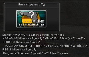 обновление состоится [27.10.2010] ну во-первых масочка для грядущего праздника хеллоуина Вложение 7022 Маска тыквы Защита +++ Способности: - Антишлем. - Точность первого выстрела с 27 октября по 9 ноября будет проводиться конкурс ввиде миссий и получить маску Тыквы будет легче! Вложение 7023 2. добавят всего 1 карту - Карта тренировочный лагерь 3. оружка добавят всего 2 дробаша за гп : 1 870 MCS* W Вложение 7024 2 M1887 Вложение 7025 а также 1 пуху за бабло: Colt Python Вложение 7026 4. Cash шоп. Шлемы, маски и купоны. масочки спешл фо русский пб Российская маска Вложение 7027 Защита +++ Способности: - Антишлем. - Точность. Украинская маска Вложение 7028 Защита +++ Способности: - Антишлем. - Точность. Белорусская маска Вложение 7029 Защита +++ Способности: - Антишлем. - Точность. Казахстанская маска Вложение 7030 Защита +++ Способности: - Антишлем. - Точность. Шлем обнаружения с5 Вложение 7031 Шлем показывает расположение c-5 как на мини карте, так и при помощи датчика Купоны Эксппансивные патроны Вложение 7032 + Урон +5%, точность +5% - Скорость передвижения -10% * Купон нельзя активировать вкупе с купоном на кумулятивные или трассируещие патроны. 5. Коробки, наборы, бомбы гига бомба Вложение 7033 Можно получить: • Очки 2,000 / 5,000 / 10,000/ 1,000,000 • Опыт и Очки 200% на 1 день • Опыт 200% на 1 день • Очки 200% на 1 день • SG 550 MB +10% Exp/GP на 1 день • Ускорение воскрешения на 1 день • Дополнительные патроны на 1 день Комплект выживания Вложение 7034 Можно получить: • Усиленный шлем на 1 день • Кумулятивные патроны Купон на 1 день • Трассирующие патроны Купон на 1 день • Экспансивные патроны Купон на 1 день • Здоровье +10% на 1 день • Тяжелый бронежилет на 1 день • Шлем повышенной прочности на 1 день • Костюм Красная гадюка на 1 день • Костюм Шкура на 1 день Ящик с оружием 1д Вложение 7035 Можно получить: • SPAS-15 Silver на 1 день • MK.46 Ext Silver на 1 день • G36C Silver на 1 день* Вложение 7036 • P99HAK Silver на 1 день • Spectre Silver на 1 день • PSG1 Silver на 1 день * G36 Silver от обычной отличается лишь тем, что оружие можно носить без требуемого звания и брутальный серебряный цвет. Ящик с оружием 7д Вложение 7037 Можно получить: • SPAS-15 Silver на 7 дней • MK.46 Ext Silver на 7 дней • P99&HAK Silver на 7 дней • Spectre Silver на 7 дней • HK PSG-1 Silver на 7 дней • Dragunov Silver на 7 дней • G36C Ext Silver на 7 дней Вложение 7036 • K-201 на 7 дней Вложение 7038 Боевая капсула 1д Вложение 7039 Можно получить: • P99HAK Silver на 1 день • Шкура (Тарантула) на 1 день • Шкура (Зоркий глаз) на 1 день • Dual Knife на 1 день • FlashBang на 1 день • MP5K Silver на 1 день • SG 550 Silver на 1 день • M1887 на 1 день Боевая капсула 7д Вложение 7040 Можно получить: • P99HAK Silver на 7 дней • FlashBang на 7 дней • M4A1 Silver на 7 дней • Spectre Silver на 7 дней • Amok Kukri на 7 дней • Костюм (Тарантула) на 7 день • Костюм (Зоркий глаз) на 7 день • Легкий бронежилет 5% на 7 дней • Здоровье +5% на 7 дней • M1887 на 7 дней |