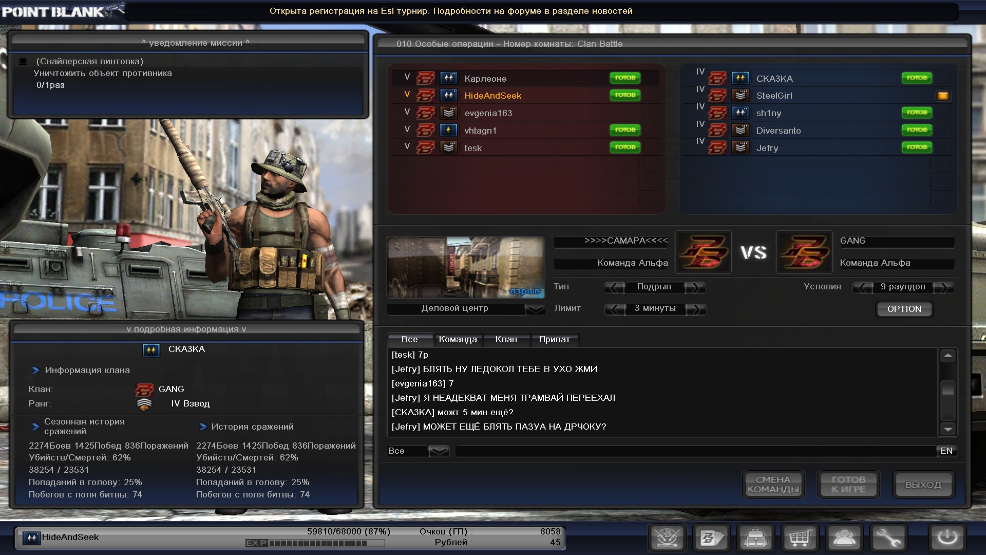 Ушел я из клана из-за того ,что общий уровень скилла игроков в ПеБе увеличился , а мои соклановцы никак не прогрессировали ,хотя играли чаще меня . Потом они начали качаться на генераторе и бегать с СЕ . (не все ,но некоторые ) Вообщем я вышел и начал искать клан . И почему я блеадь наткнулся на страничку ганга ? Оттуда я узнал ,что ганг распался и оставшиеся перешли в Халакост . Ну я недолго думая зарегистрировался на гладпвнз и подал заявку в