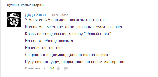 сижу я такой смотрю RWJ Рэй RWJ - ШОКИРУЮЩИЙ КОНТЕНТ - YouTube И тут видос на 1:46, который пиздец зацепил The Knife Song - YouTube Песенка понравилась, хожу напеваю, chop chop chop И решил перевести и переделать: У меня есть 5 пальцев, ножиком топ топ топ И если мне места не хватит, пальцы к хуям разорвет Кровь по столу хлынет, я заору "ебаный в рот" Но все же ебашу ножом я Напевая топ топ топ Скорость я поднимаю, дальше ебаша ножом Руку себе отхуяру, попращаясь со своим мастерством daundaundaundaun Оригинал: Oh, I have all my fingers, the knife goes chop chop chop If I miss the spaces in between, my fingers will come off And if I hit my fingers, the blood will soon come out But all the same, I play this game, cause that’s what it’s all about Oh, CHOP CHOP CHOP CHOP CHOP CHOP CHOP I’m picking up the speed And If I hit my fingers then my hand will start to bleed |