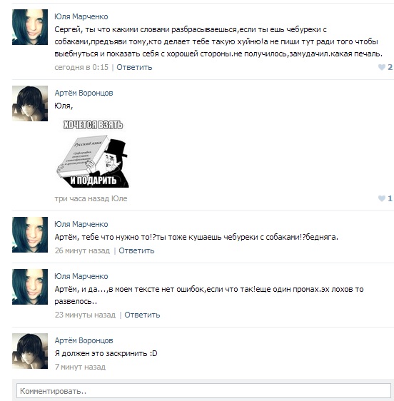 Ну хватит тупого пиздежа, а то не все дойдут до процедуры исправления, ведь "МНОГО БУКАФФФФФ БЛЕАААААТЬ!!!!111!!!!11" Началось все с этого: Как видим, девушка не обременна интеллектом: каждое новое предложение с маленькой буквы, совершенно ненужное и неуместное троеточие, после которого следует запятая (Nuff Said). Продолжаем: Знаем мы на каком месте она сидит, не будем уточнять, ибо мы очень культурные нахуй, а сайт все таки для элиты, нужно соответствовать. На этом мое "интервью с ТП" закончилось. Казалось все, конец, железный занавес опущен! Но не тут-то было... Оказалось, что у либеральной ТП есть брат. Сначала я подумал, что это очередной пиздализ, но нет, оказалось брат. На это первый выпуск "Окупай-тупопиздофиляй" закончен. Не уверен, что еще будет. Удачи! |