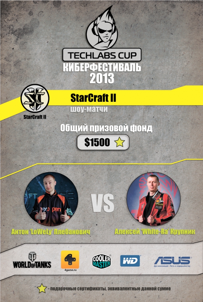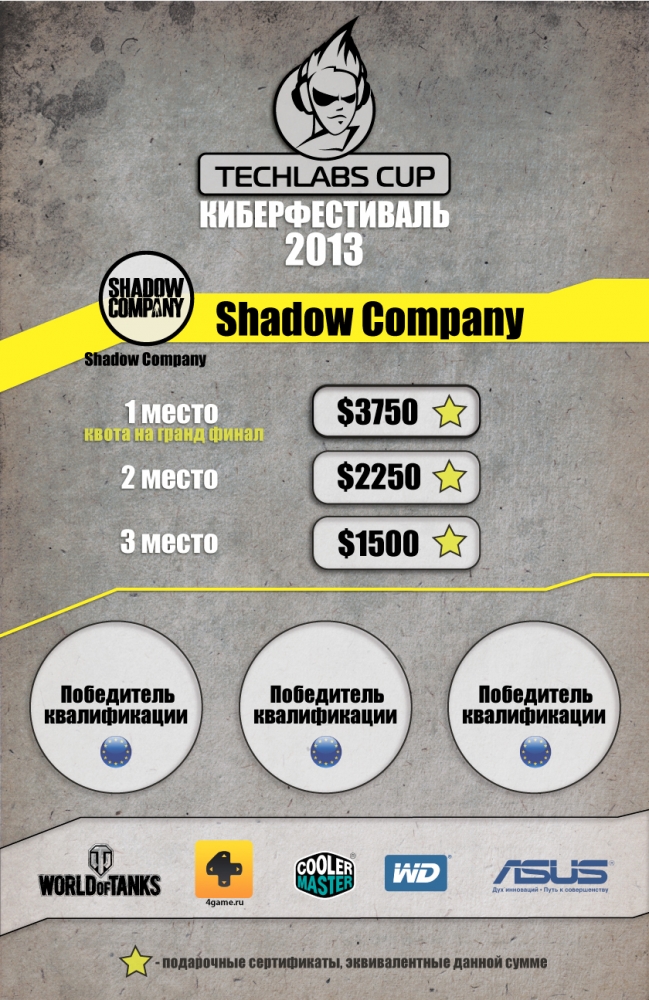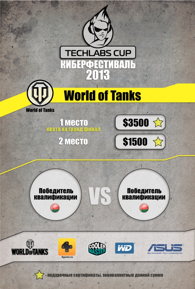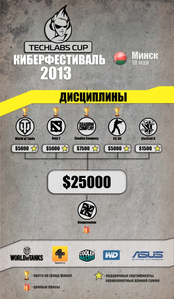 Официальными дисциплинами фестиваля TECHLABS CUP BY 2013 стали: World of Tanks, Shadow Company, Dota 2, Counter-Strike:GO, StarCraft II. Собственно говоря, как всегда, в номинации Counter-Strike: GO будет приглашена одна из топ команд планеты, на этот раз ими окажутся ESC-Gaming, ведь ребята и вправду достойны этого, а этой элите будут противостоять одна из команд, которая будет бороться за право выхода в финал к отцам КСа в открытой квалификации с 4 по 5 мая включительно. В финале победившую команду будет ждать 6 кусков зеленых($6000), шлюхи, пиво и блэкджек. Что касается Dota 2, то здесь уже участие будут принимать две команды, одна из которых конечно же будет приглашена, а другой также придется бороться за финал, следовательно квоты на следущий этап будет всего две, одну из которых, помимо самого финалиста, получит команда победившая всех в квалификации, которая будет проходить 28 числа текущего месяца. Посетить, и возможность выиграть в номинации StarCraft II выпала сильнейшему старкрафтеру Беларуси – Антону ‘LoWeLy’ Плебановичу и не менее известному Алексею ‘White-Ra’ Крупнику. Соревновательная составляющая отсутствует, только шоу-матч. Отборочный тур по Shadow Company на этот раз будет открытым и полноценным. Очень скоро, а именно 27 апреля, вы узнаете кто же окажется в числе тех трех команд-счастливцев, которые в финале будут бороться за $7 500. В дисциплине World of Tanks соревнования будут носить LAN-статус, поэтому будут допущены только те команды, которые имеют гражданство Белоруссии. Уже 17 апреля начинается регистрация отборочного он-лайн турнира. Расписание отборочных: