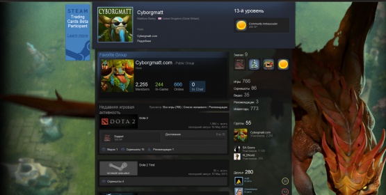 Помимо обновления страниц компендиума The International 3, в которым были добавлены новые сверхплановые цели и вскоре будет достигнута еще одна. Вот тогда, и получат все счастливые обладатели книги еще кучу новых плюшек. Но не в этом суть. Вчера ночью в Steam была добавлена очень необыкновенная фишка - Коллекционные карточки Steam. За счет этих карточек вы можете кастомизировать задний фон вашего профиля, но для этого сначала нужно записаться на бетатест здесь, но это тоже самое, что было ждать инвайт на Dota 2 год назад, поэтому, если вам это интересно вы можете его купить. Лично я приобрел вчера за 80 р., но уже сегодня в обед(или утром) цена упала до 20 р., поэтому поторопитесь! Итак, за вермяпровождение в вашей любимой игре вы будете апать ачивки, как в старой доброй CoD и, на ряду с этим, получать эти самые карточки. Всего их 8, четыре из которых дропаются в игре, а четыре остальных вам нужно либо выменять у других пользователей, либо купить на Торговой площадке Steam. При получении фуллового набора, вы можете их сложить, и у вас рандомно получится один из 6 интерфрейсов, а также появится значок, украшающий ваш профиль. Всего бэкграундов много, но по тематики Dota на данный момент их 6. Вложение 78514Вложение 78515 Вложение 78516Вложение 78517 Обновление 17 мая! Новые вещи 17 Мая! (New Items 17 May) - YouTube Игровой процесс Цитата: