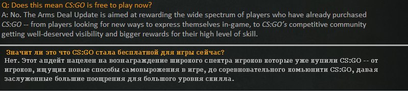 Валвэ жи есть красаучкики уаще! Взяли и обновили CS:GO прошедшей ночью, куча школьников забросили вечерний фапотрон и ринулись обновлять клиент, а прилетело не много не мало порядка 500 метров. Незадолго до обновления интернет бомбила весть о грядущих планах компании, которая не любит «три», многие пророчили переход на систему F2P (играют все, платят способные), а так же кардинальные изменения в самой CS:GO. Но пока халявы не видно, а клиент обновился не так кардинально как мы себе это представляли, хотя скорее всего просто уже зажрались. Не стоит расстраиваться на счет системы F2P так как шанс перехода CS:GO именно на нее очень велик, на данный момент пацаны решили не загружать игроков столь кардинальными изменениями и что бы не получить огромный наплыв новых школьников решили немного притормозить процесс, но по некоторым данным желтой прессы, возможно переход на F2Pнас ждет 21 августа, поживем посмотрим…