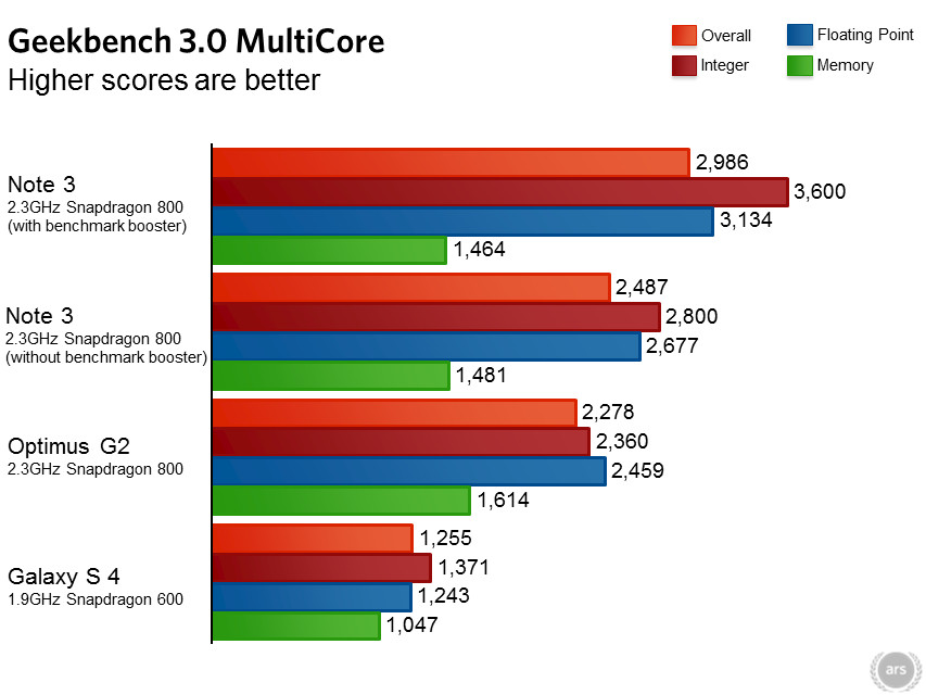 Ars Technica протестировал Samsung GALAXY Note 3 с процессором Qualcomm Snapdragon 800. В синтетических тестах он ,естественно, опередил LG G2 с таким же процессором, графическим ускорителем и разрешением дисплея. НО! Объясняется это тем, что при входе в любое приложение для синтетических тестов, у Samsung GALAXY Note 3 активировались все четыре ядра с установкой максимальной частоты — 2,26 ГГц. Это случается просто после входа в прилажку, еще до начала теста. В обычной ситуации (в любой другой прилажке) при бездействии работало лишь одно ядро с минимальной частотой 300 МГц.