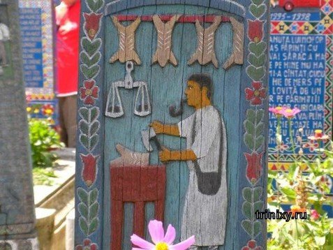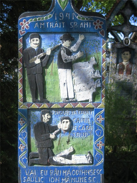 Все достаточно просто. Основатель кладбища - Йон Петраш (Захороненный кстати на этом же кладбище) смастерил первый "Веселый крест", украшенный разноцветными узорами и смешной надписью. Священники посчитали это огромным грехом, а партийный секретарь сразу написал жалобу самому генеральному секретарю в Бухарест. Родственники покойной были полностью согласны с тем, что могилу будет украшать веселая атрибутика. (Это будет сгонять тоску глядя на фотографию, заявили они).