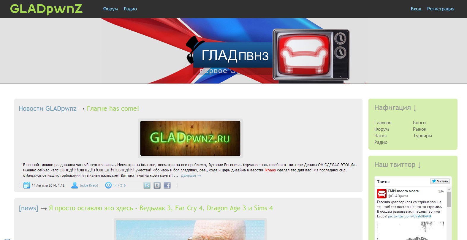Ну что ж, прошел ровно месяц с тех пор, как самый элитный сайт рунета восстал из пепла, аля феникс. За этот месяц было проделано довольно много работы. Иногда все было плохо, иногда все было хорошо, но мы сделали то, что запланировали и это главное. Егор наконец выгнал всех самых элитных проституток Москвабада из дома, слил в унитаз все свои запасы самого элитного бухла и принялся за работу. Итак, что же изменилось/добавилось на сайте: Система блогинга Твиттер для быдла, жжшник - хуже пидараса. Я всегда так считал, но в тоже самое время хотелось какой-то уголок, где я могу просто и свободно высказать свои мысли, но чтобы при этом, это был мой собственный уголок. С добавлением блога моё желание исполнилось. Если у вас есть какие-то интересные мысли и вы хотите, чтобы все их увидели, но не хотите заморачиваться с оформлением, чтобы она попала на главную, то вы можете запостить их в свой уютненький блог. Заебала своя музыка заслушанная до тошноты? Радио шансон в маршрутке не помогает? Друзья - быдло слушают АК-47 и не могут покидать годноты? Тогда рады вам сообщить, что вместе с сайтом возвращается и GladFM! Уже было проведено несколько пробных эфиров, один даже с конкурсом и призами (спасибо Вуди за это). Набрали несколько новых рджеев, готовых сутки на пролет крутить разного рода годноту и общаться с вами. Стоя за GladFM! Новая главная страница Пожалуй, самое долгожданное нововведение в истории глада. Мы ждали этого 5 лет, 5 долгих блядских лет. Ждали, когда Егор одуплится и наконец запилит новую удобную главную неведанной красоты. Но Егор не мог или не хотел. Клиническая смерть глада стала для него охуенным пинком под зад, как и для всех админов. Даже будучи очень больным, он не опускал руки и кодил ночи на пролет. Новая главная страница Gladpwnz.ru запилина СЕГОДНЯ! Да, некоторые недовольны, но я считаю, что тут, как со стеной вбыдлятнике - дело привычки. В конце концов, главная стала красивей и гораздо удобней. #Егорверниглагну, #Егорспасибо Вся хуйня по мелочи
