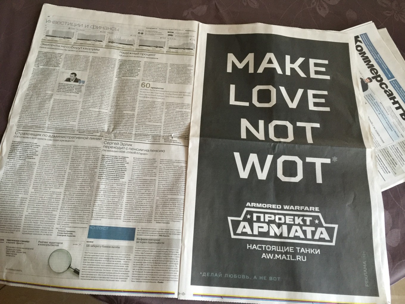 Мыло все пытается затролить Wargaming и делает очередную выпадку выкупив целый разворот в газете "Коммерсант" от 28 марта 2016 года на котором разместила слоган "Make love not WoT" (Занимайтесь любовью, а не WoT). При этом в компании прокомментировали, что WoT никак не связано с известной танковой онлайн-игрой, а расшифровывается, как: Waste of Time (тратить время впустую)». В Wargaming'е отреагировали на это картинкой: |