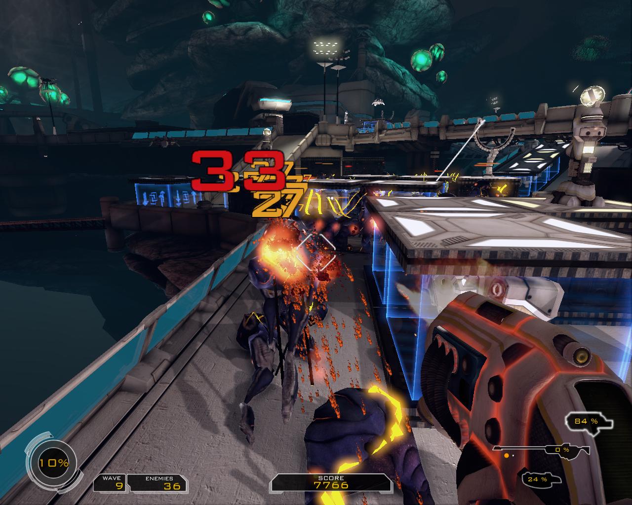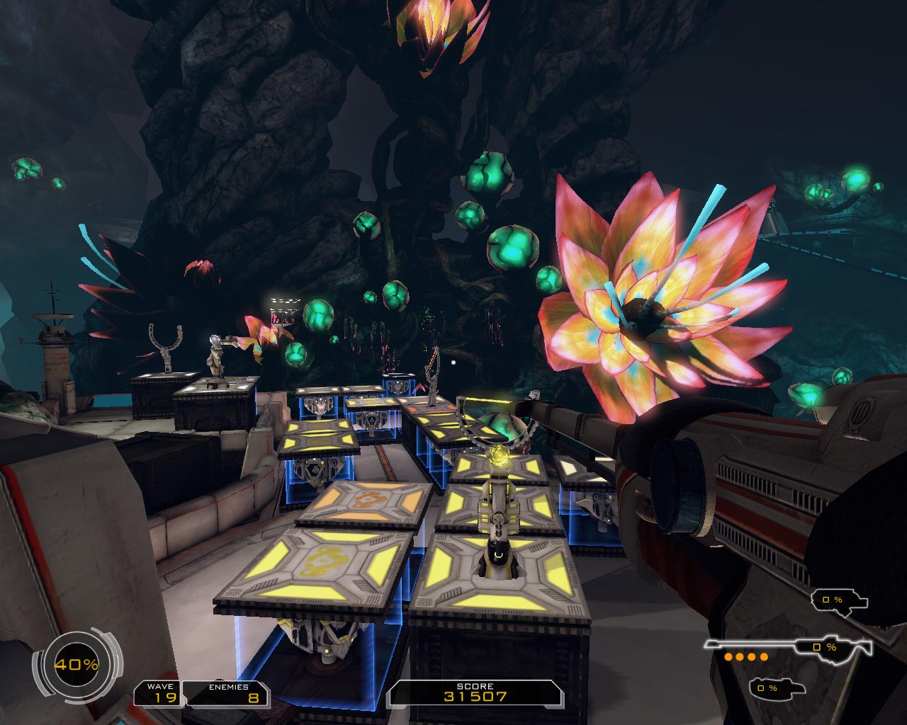 Вложение 16454 Ждал-ждал, кто же сделает обзор-рассказ про игру. Увы придется сделать мне - так как ПБ вконец стала такой ёбнутой, что даже не хочется вспоминать те первые, замечательные дни познания ПБ. Но сейчас не об этом - что это я и в самом деле, расплакался тут :) бррррр, начнем-с. Вложение 16456 Действие игры происходит в футуристических декорациях. Неизведанная планета, небольшой участок базы колонистов и волны местной фауны, стремящейся стереть с лица родной планеты непрошенных гостей. Пока большие и сильные колонисты-мужчины пропадают неизвестно где, долг защитить «святая святых» ложится на плечи хрупкой девушки с большой пушкой наперевес. Конечно, когда вы отразите все волны монстров, колонисты порадуются вместе с вами, но пока приходится рассчитывать только на свои силы.Монстры, вообще то, не такие уж и монстры, возможно, они даже травоядные, а не хищники, так как убить или покалечить все равно никого не могут. Они могут только бежать к своей цели, обходя препятствия. Их цель – Святыня, некое энергетическое ядро, находящееся в самом центре новенькой базы колонистов. Так как когтей и жвал у фауны нет, приходится брать числом. Ядро же в свою очередь может выдержать определенное количество повреждений от «ныряющих» в него монстров, после чего произойдет коллапс и от базы не останется и следа. Игра представляет собой вариацию на тему tower defense, в которой все действие происходит от первого лица. \При нажатии кнопки Tab можно взглянуть на карту с высоты полета местных перепончатокрылых\. У вас есть три разнообразных локации, на которых будет происходить действие. Все начинается с обустройства надежной \или какой получится\ защиты вашей базы. В вашем распоряжении – либо одна большая площадка, либо несколько маленьких, соединенных между собой. На этих площадках вы можете построить лабиринт из блоков с помощью специального устройства. Далее каждый блок может быть оборудован одним из пяти видов стационарных турелей либо лифтом-телепортом \с помощью которого можно подняться на свое сооружение или переместиться в другой такой же лифт-телепорт\. Кроме того, вы можете расположить на пути следования монстров замедляющие плиты. Каждая из турелей уникальна и отличается внешне и по характеристикам. Что то стреляет быстро, но слабо, что то бьет редко, но сильно. Есть турели, стреляющие только по наземным целям, только по воздушным или универсальные но слабые. Будьте готовы к тому, что как бы вы хорошо не обустроили свой лабиринт, турели не смогут уничтожить всех монстров!Вот тут и начинается FPS… У героини есть при себе три вида пушек с основным и альтернативным способом ведения огня \в описании присутствует еще и четвертая пушка с ультимативными параметрами, но где ее взять я так и не понял, возможно она припасена для кооператива\. Патронов нет, но оружие перегревается и если вы дали ему перегреться, не сможете стрелять, пока оно не остынет полностью. Поэтому только постоянное и грамотное чередование оружия сможет вас спасти от бессильной злобы, когда стрелять нечем, а монстры все ближе. И хотя монстры не смогут вас убить, каждое касание к ним вызывает у героини бурную реакцию, которая также мешает ей отстреливаться, так что бег по стенам лабиринта – верная стратегия почти всегда. Когда волна отражена, вы получаете определенное количество очков с