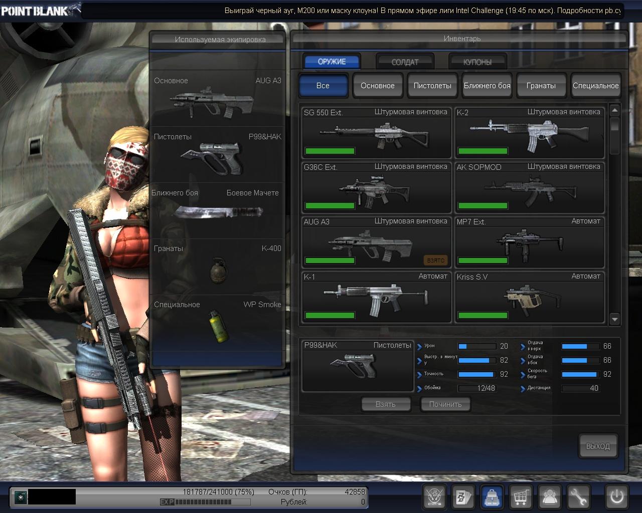 Все топ пухи:AUG A3,kriss,ak-47 sop.mod, дробовик m1887,диглы,глок 18 т.д Скины баб на 100 дней за гп Купоны:быстрая смена(67д),быстрая перезадка(67д),быстрое разминирование(67д),своб.вых од(67д),доп.боеприпас(67д)и на опыт на 10д 2 купона. УС акк 68%!до апа 20%! По всем вопросам в скайп andrey1984qpak цена акк 1000 рублей (яндекс) Вот скрины: