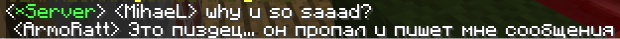 ![]() Вообщем я увидел в чате сообщения от Михаеля. Решил проверить, Михаеля на сервере не оказалось и я начал очковать. Но потом Фрешка обьснила мне что он тупо писал с консоли. Вроде как и не особо страшного ничего не было, но мне было ссыкотно.