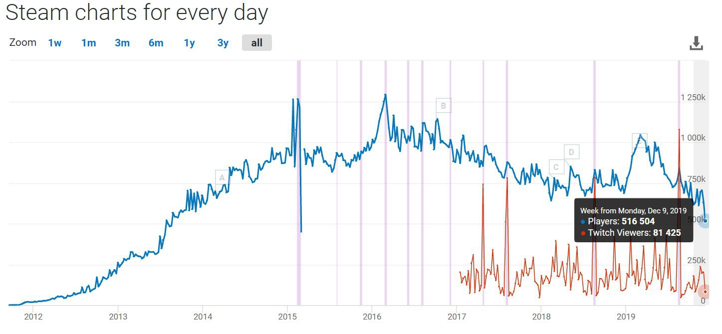 Даже не смотря на то, что Дота 2 - это то, что на слуху у каждого и везде, про «Дотку» знают даже те, кто сами по себе далеки от компьютера, а игры последний раз видели только по телевизору, Dota 2 теряет к себе интерес. Вчера, 9 декабря был зафиксирован самый низкий онлайн в игре, такого не было очень давно, по данным портала Steam Database девятого декабря в игре был пик в районе 516 тысяч пользователей, хуже только в 2013 году, когда пиковые значения составляли 486 тысяч пользователей. И дело даже не в том, что игроки «устали» от Доты или поколение Дотанов наконец-то устроилось на работу, а в том, что крупное обновление The Outlanders, которое Valve выкатили сразу после Мейджора 25 ноября. Оно принесло в игру лесные предметы, аванпосты и двух новых героев Void Spirit и Snapfire. Сразу после этого онлайн стал резко падать и по всей видимости цифры, которые нам показали 9 декабря, не конец всей истории. Как вы считаете, в чем же реальная проблема? Почему онлайн падает, словно интерес Панина к мопсам? И что будет с Дотой дальше.