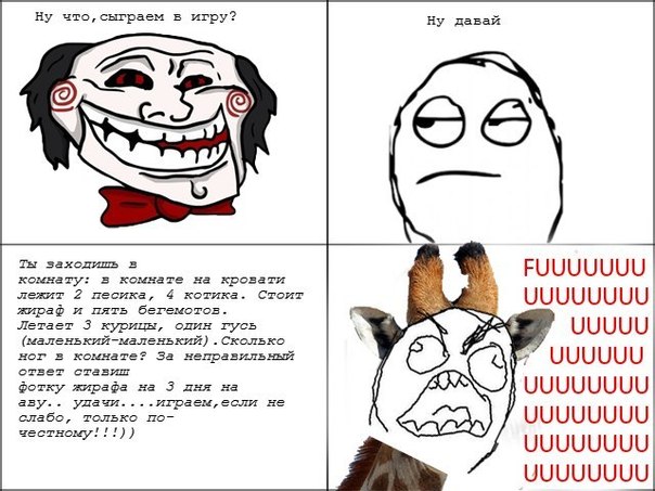 Загадка про количество ног в комнате появилась на просторах интернета всего несколько дней назад, а сегодня жирафы на аве вконтакте стоят у тысяч людей по всей стране. Ну и конечно же эта ситуация разделила интернетчиков на 2 лагеря,- собственно тех кто ставил себе подобную аву или считает это прикольным...и тех, кто люто ненавидит первых и удаляет всех друзей-жирафов, считая их слишком тупыми.
