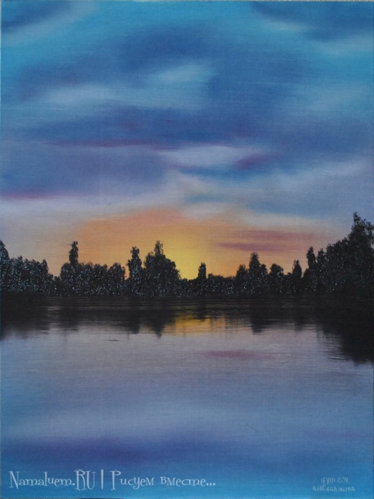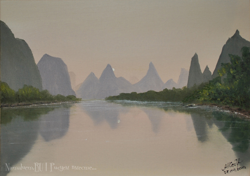 Гора, поле, водоем, луна, закат/восход, птичка. Выбрать желаемое, нарисовать. В галерее ничего интересного, видео не смотрел - буду дома, тогда и гляну.